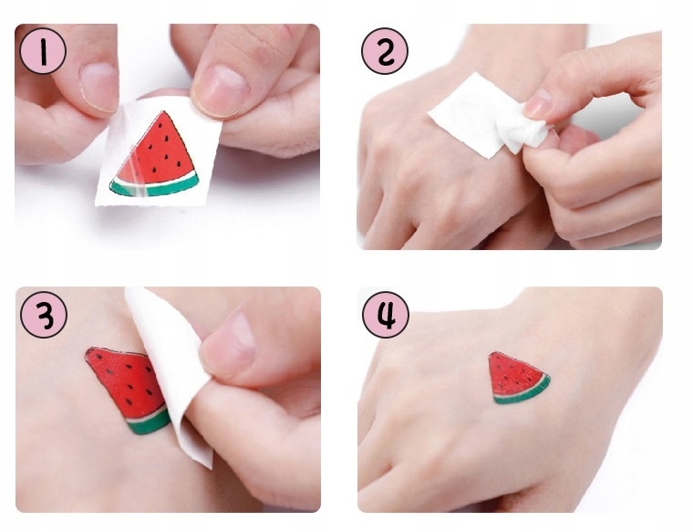 Наносити та видаляти татуювання дуже просто. Просто зніміть захисну плівку, покладіть картон із зображенням на шкіру, змочіть його губкою, змоченою у воді, на 10 секунд. Потім акуратно зніміть картон і дайте татуюванню висохнути.