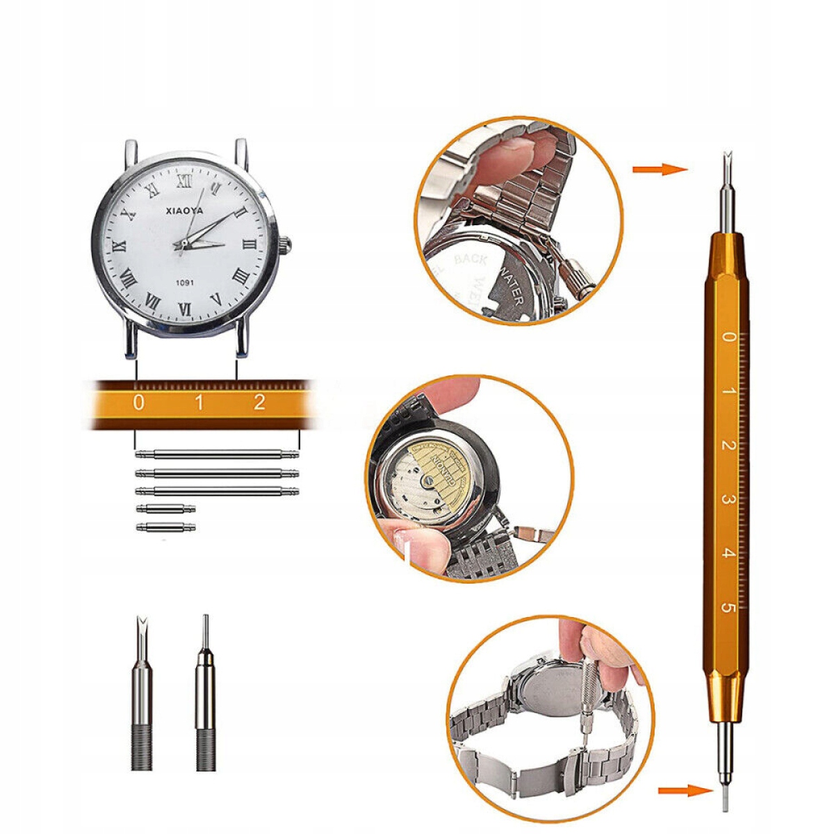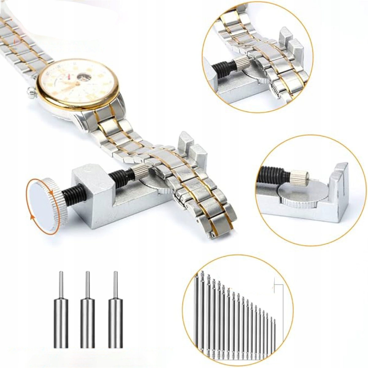 - Такі як інструменти для видалення ланок годинника, пружинні стрижні (108 шт.), пробивальні голки, відкривачки корпусів годинників та інші інструменти.