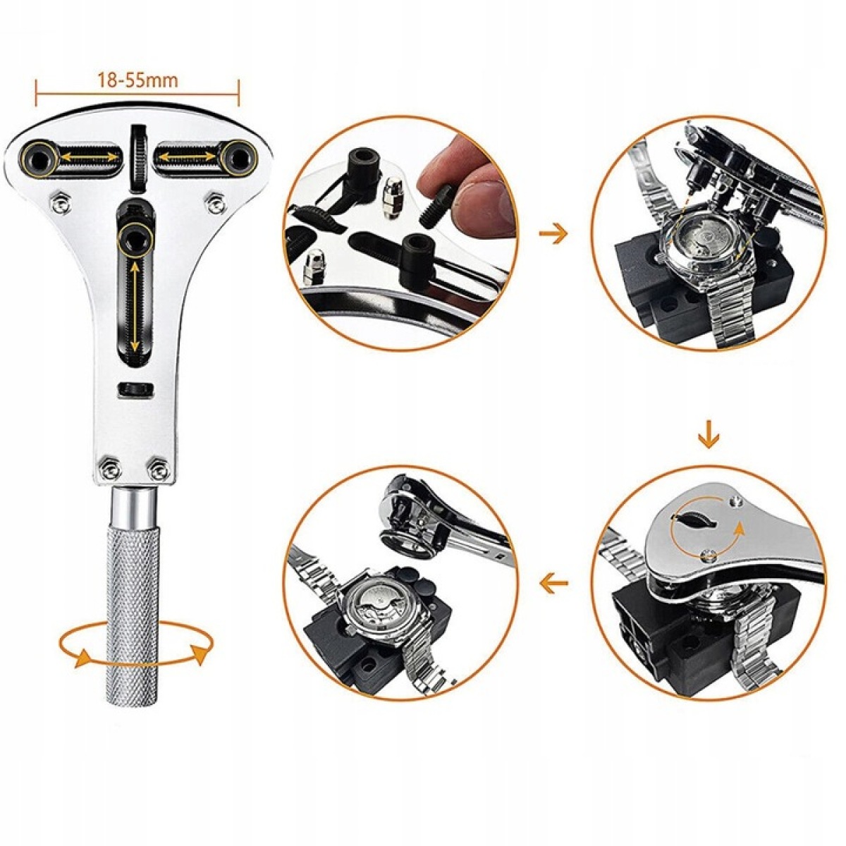 - Покращений регульований відкривач для корпусів можна відрегулювати до 52 мм, що полегшує відкривання задньої кришки, що загвинчується звичайні та великі годинники