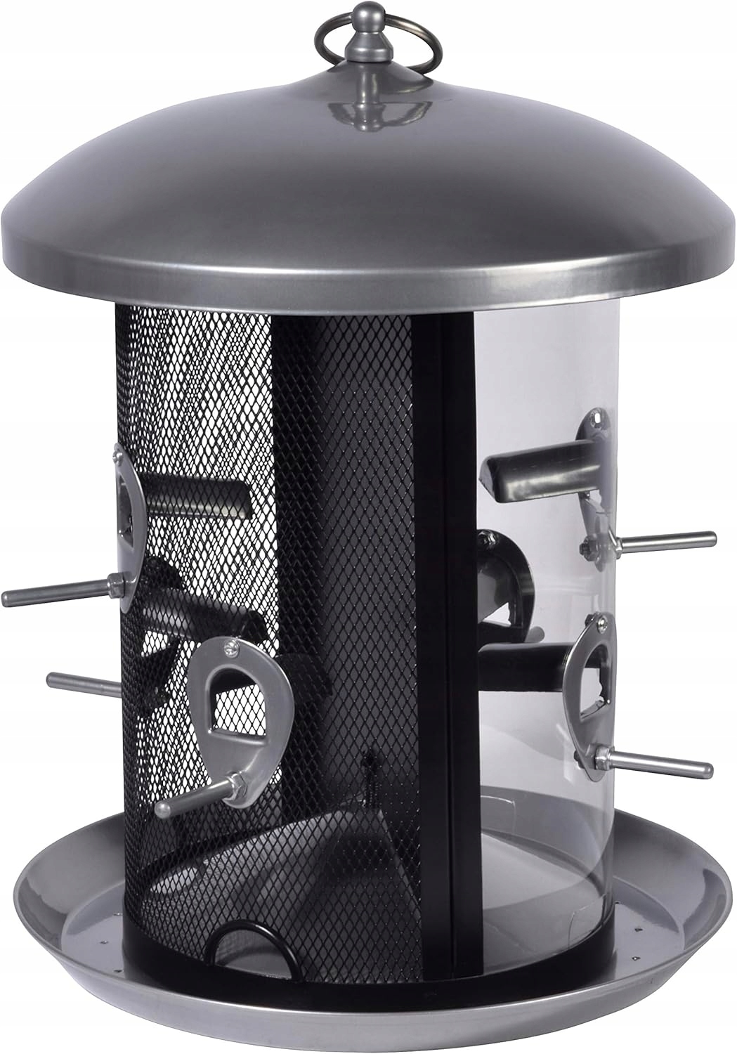 Шість кормових отворів із жердинами забезпечують тягу для кількох голодних диких птахів і запобігають суперечкам у місці годування.