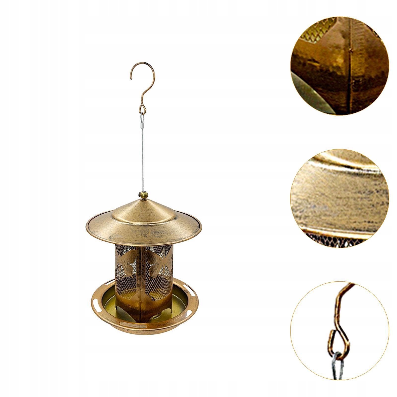 [Металева конструкція]: Зроблений з твердої залізної матеріали, цей годівниця для птахів була розроблена для витримки зовнішніх умов. Він має сильний висячий гачок, що робить його ідеальним для призупинення садів або на внутрішній дворик