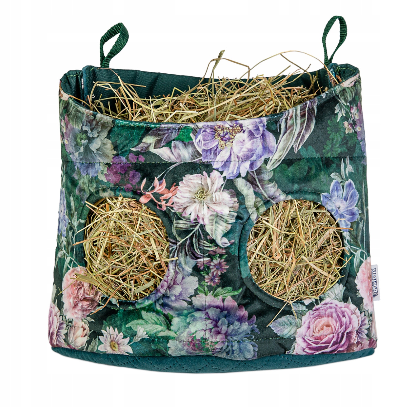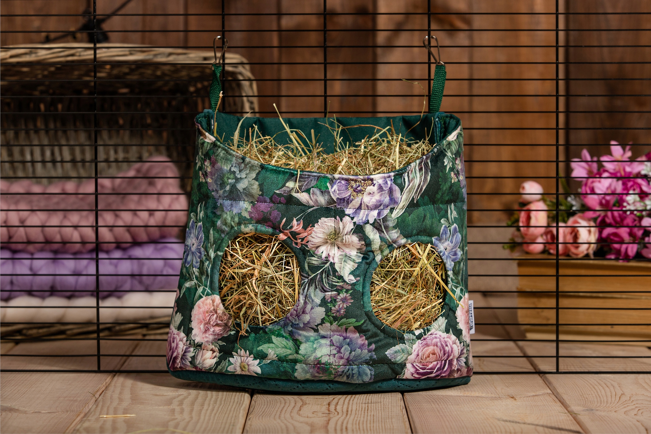 Годівниця для гризунів і кроликів з колекції Romantyczny Zakątek стане гарним доповненням до прикраси простору ваших улюбленців. Конструкція годівниці полегшує використання - ви кладете сіно зверху, а тварини дістають його через отвори. Годівниця виготовлена з оббивного матеріалу з ручками зі скотча. Конструкція годівниці додатково посилена оббивним поролоном. Внутрішня частина годівниці обшита водонепроникним поліестером, що полегшує очищення.