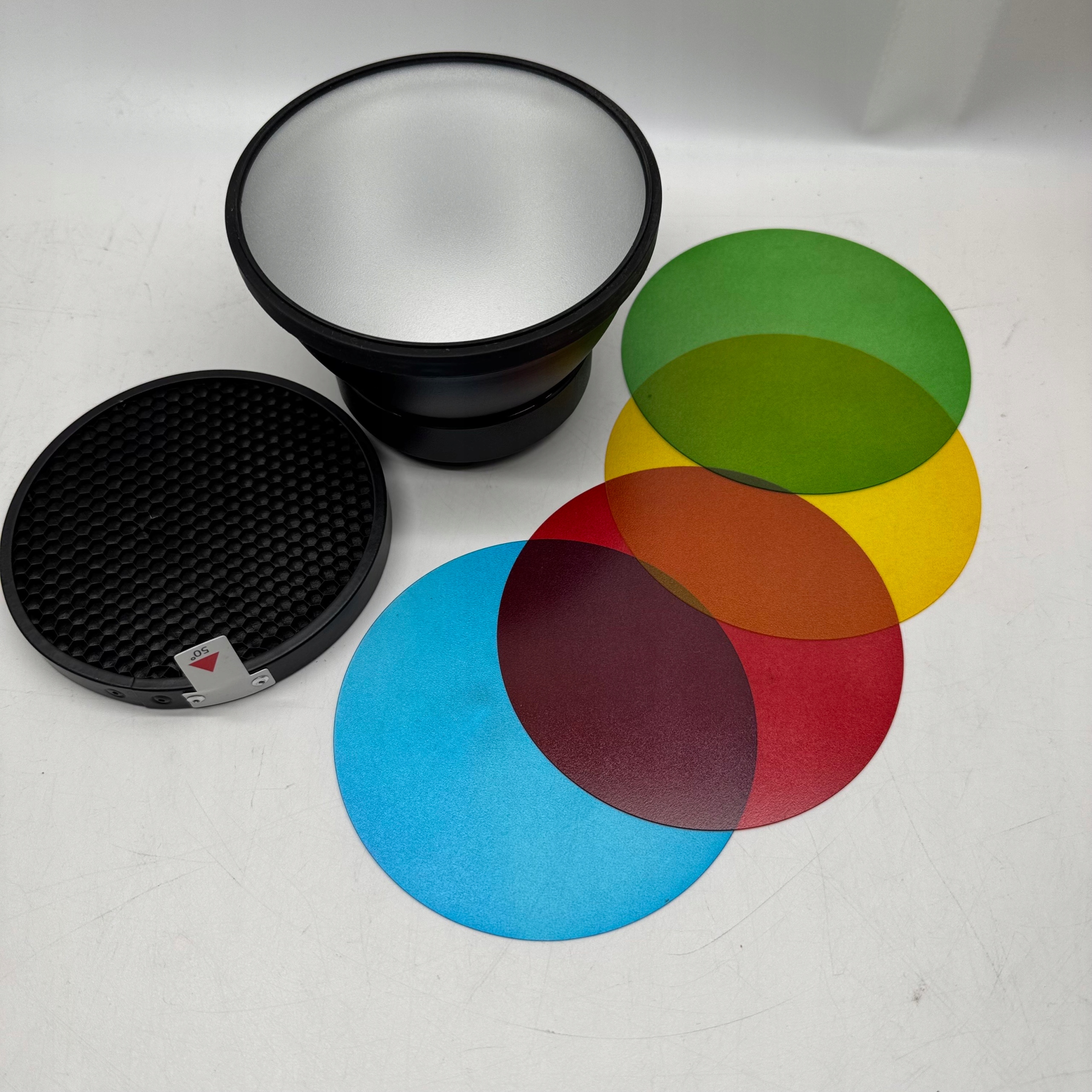- Упаковка містить 1 стандартну фари AD-R14, 1 х м'який дифузор, 1 х сітка з стільниковою конструкцією 50 градусів, 5 кольорів гелю (біла, синя, зелена, червона)