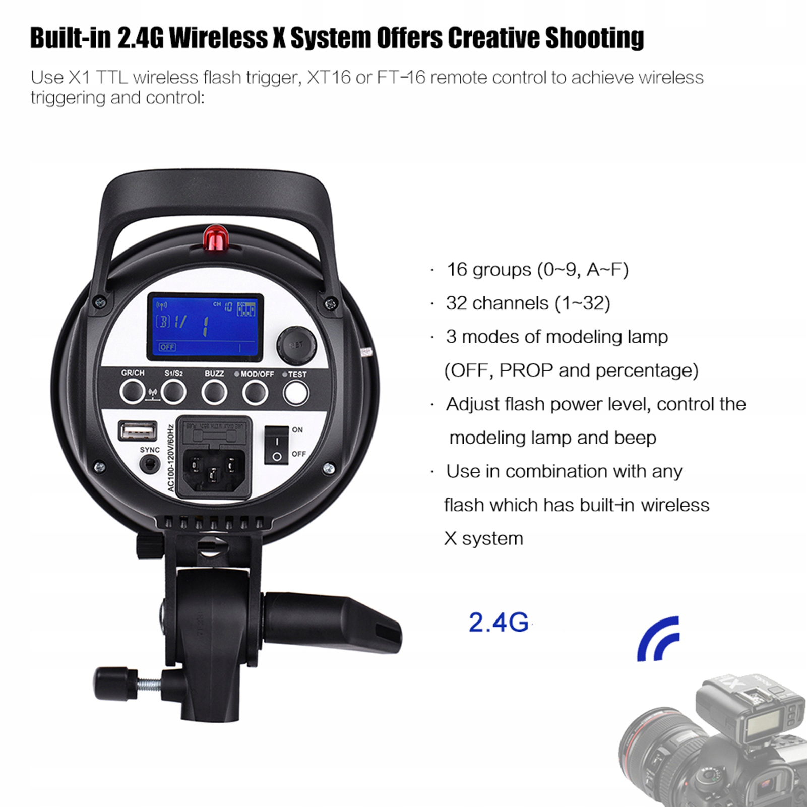 2. Вбудована бездротова система X Godox 2.4G, ви можете використовувати Godox X-Pro, X1, XT32, XT16 або FT-16, встановлений для управління флеш-коефіцієнтом потужності, модельної лампи та гудіння, а також флеглігу.