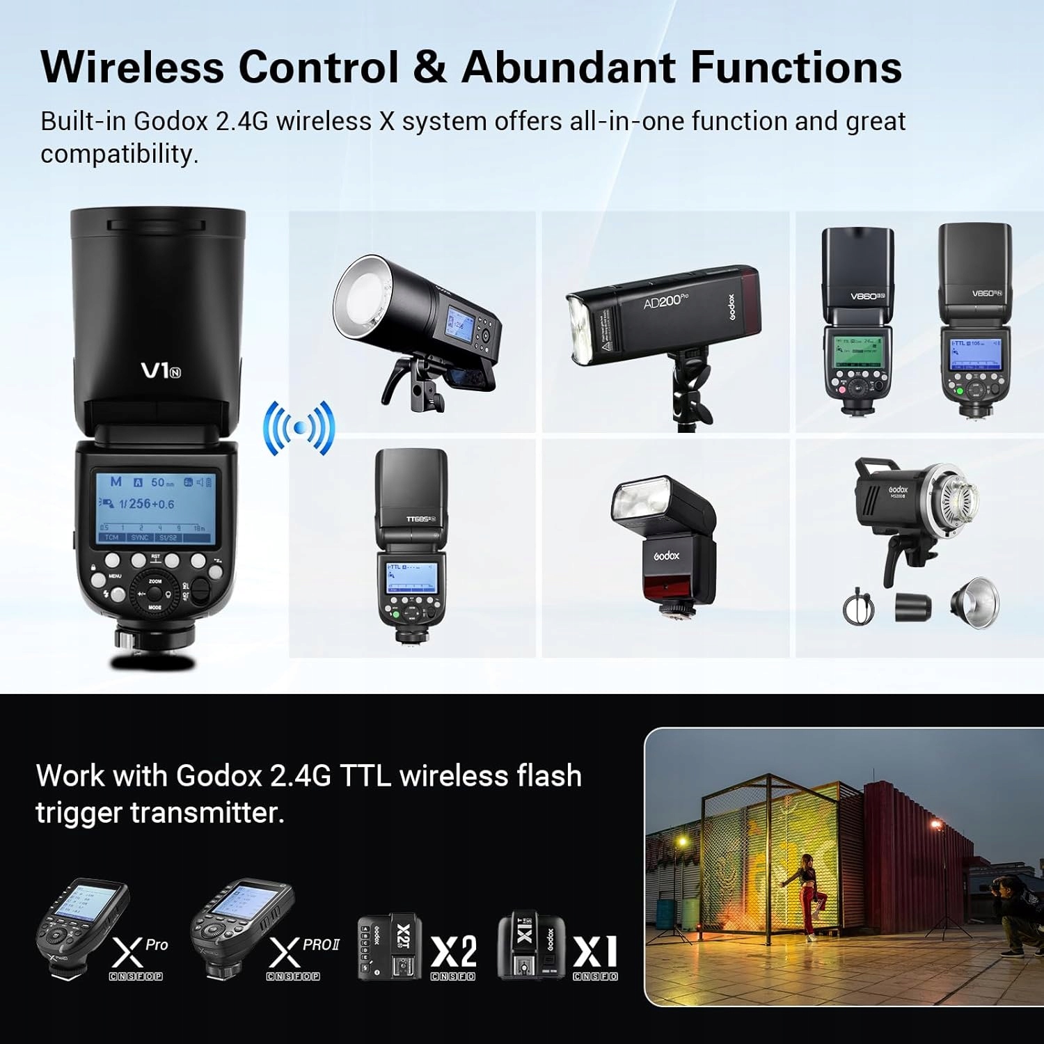 Високопродуктивний літій-іонний акумулятор Panasonic: 7,2 В/2600 мАг акумулятор забезпечує час переробки 1,5 секунди та 480 фотографій з повною потужністю. Оскільки V1 працює від літій-іонного акумулятора на 2600 мАг замість акумуляторів AA, він гарантує довгий робочий час та надзвичайно короткий час зарядки. Сумісний з передавачами серії XPRO / X1T / X2T. Підтримує USB -апаратні оновлення. Його можна використовувати як майстер для управління іншими спалахами. Він суттєво розширює можливості творчого спалаху. У програмах, де швидкість є ключовою, такий підхід не має собі рівних. Модифікатори Godox AK-R1 (продаються окремо) з магнітним кріпленням вже доступні для деяких спалахів з круглими головами бренду.