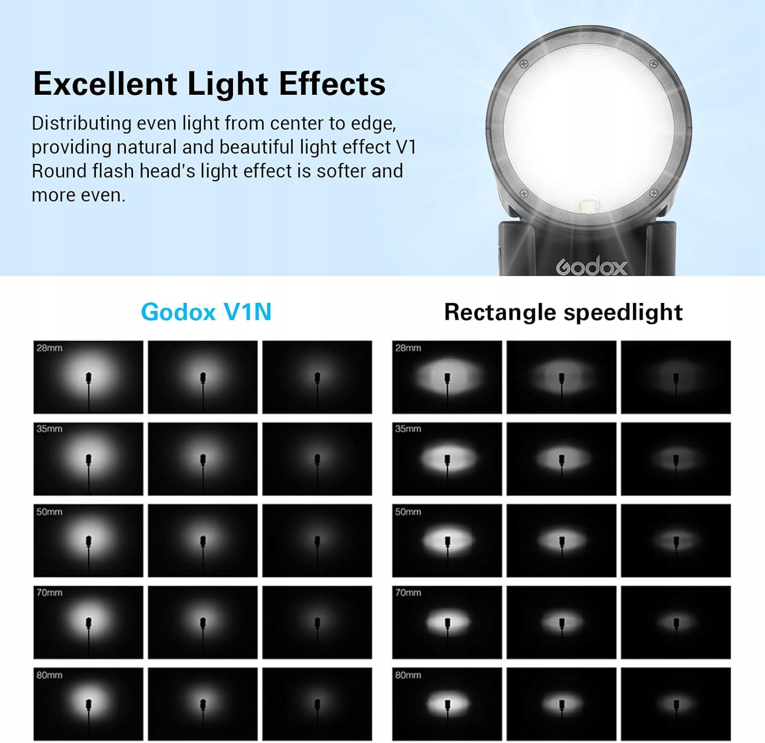 Відмінні ефекти освітлення: Інтегрована світлодіодна лампа регулюється з інтервалом від 01 до 10. Рівномірно розподіл світла зсередини в край, завдяки якому отримується природний і красивий світлий ефект. Його можна використовувати на камері або поза нею. Godox V1 має круглу голову, яка відволікає світло набагато гармонійно, ніж прямокутники традиційного спалаху. Ця головка має об'єктив Fresnell, що підвищує його ефективність. Спалах має діапазон збільшення від 28 до 105 мм; Великий кут налаштувань від 0 ° до 330 ° горизонтально і від -7 до 1 20 ° вертикально, що підвищує ефективність непрямого запису спалаху.