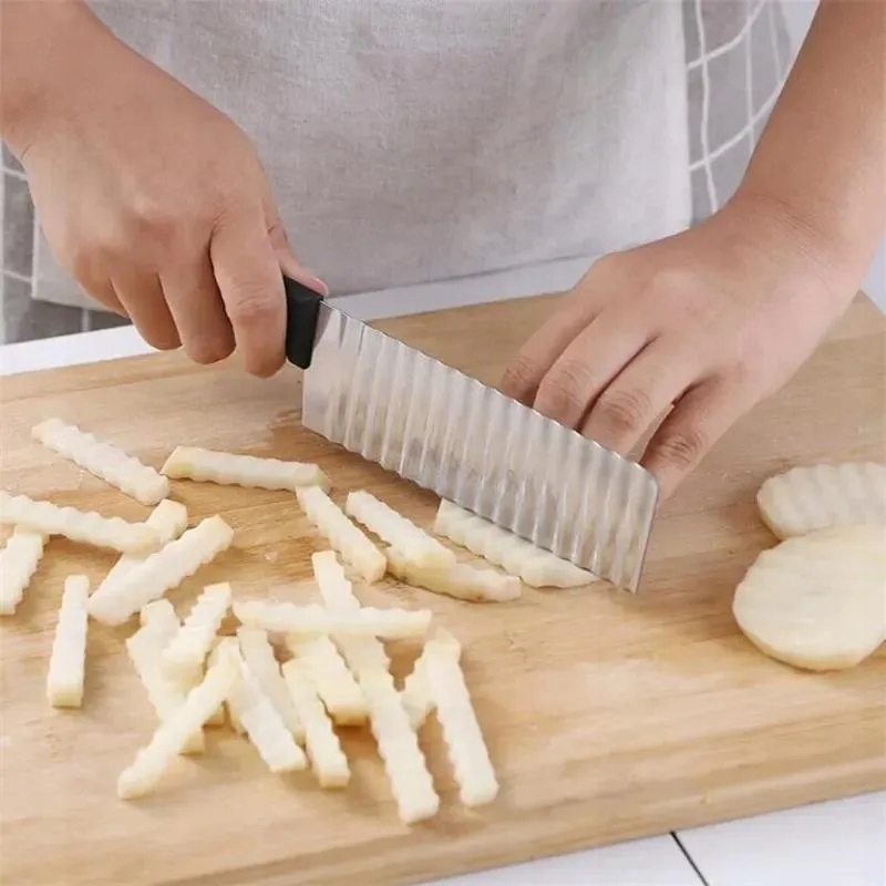 Гофрований ніж для нарізки картоплі фрі, овочів і фруктів – практичний кухонний аксесуар, який дозволяє легко надати стравам привабливий вигляд. Завдяки спеціально розробленому лезу ви можете отримати характерну хвилясту форму скибочок, ідеальну для картоплі фрі, чіпсів, овочів або декоративних закусок.