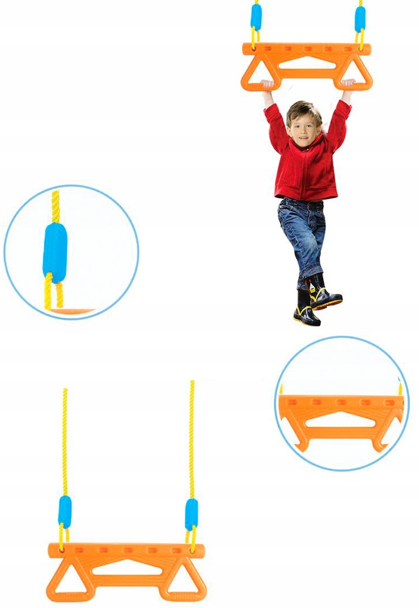 Безпека використання є пріоритетом при проектуванні гойдалок для дітей. Завдяки використанню високоякісних матеріалів, таких як міцні пластикові кільця і міцні мотузки, трапеція гойдалки гарантує стабільність і безпечну гру. Крім того, його кольорові елементи не тільки візуально привабливі, але й стійкі до змін погодних умов, що забезпечує тривале та безпроблемне використання поза приміщенням.