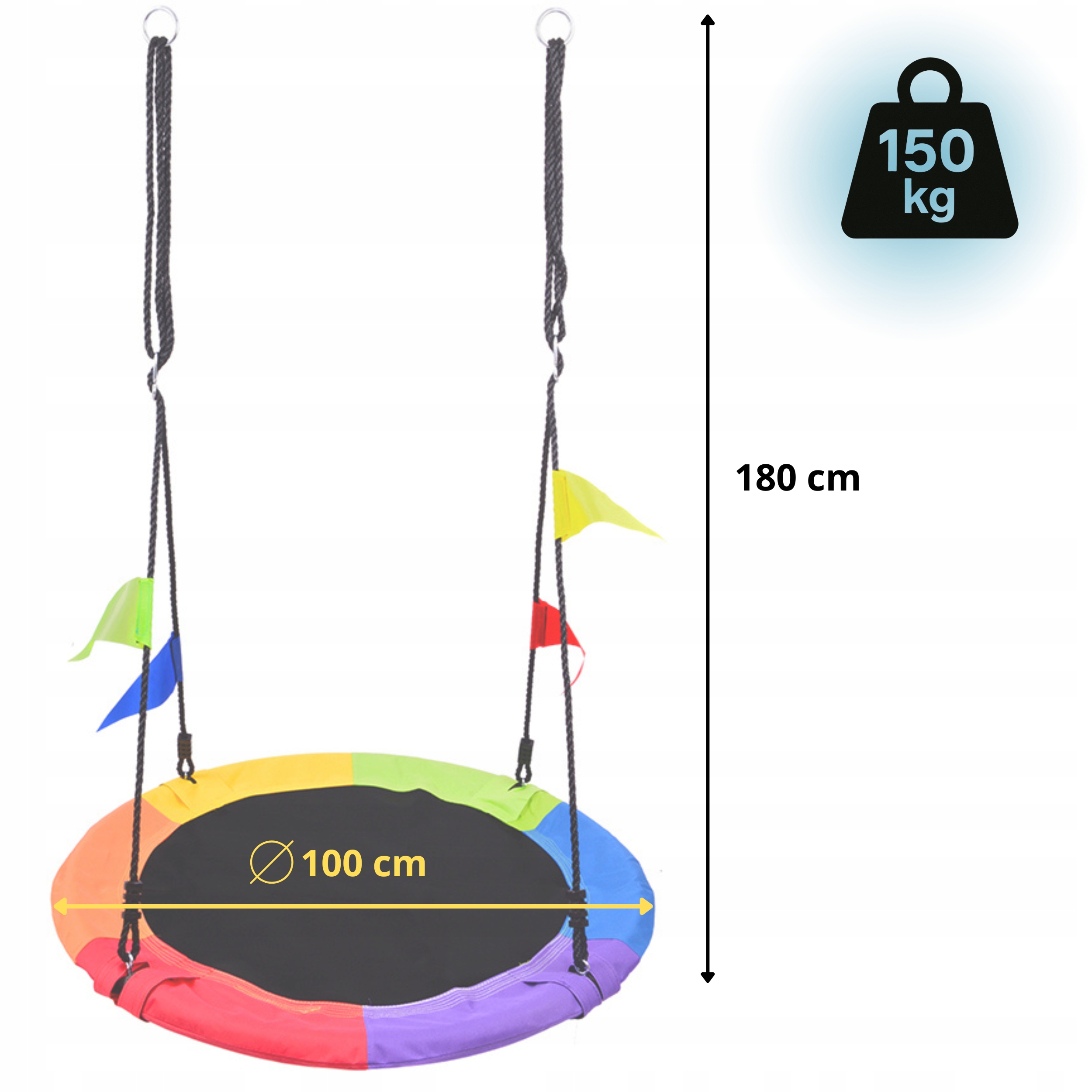 Барвистий ободок та декоративні прапори притягують зір і надають гойдалці сучасний, життєрадісний вигляд. Він добре поєднується з розташуванням саду та дитячих ігрових просторів.