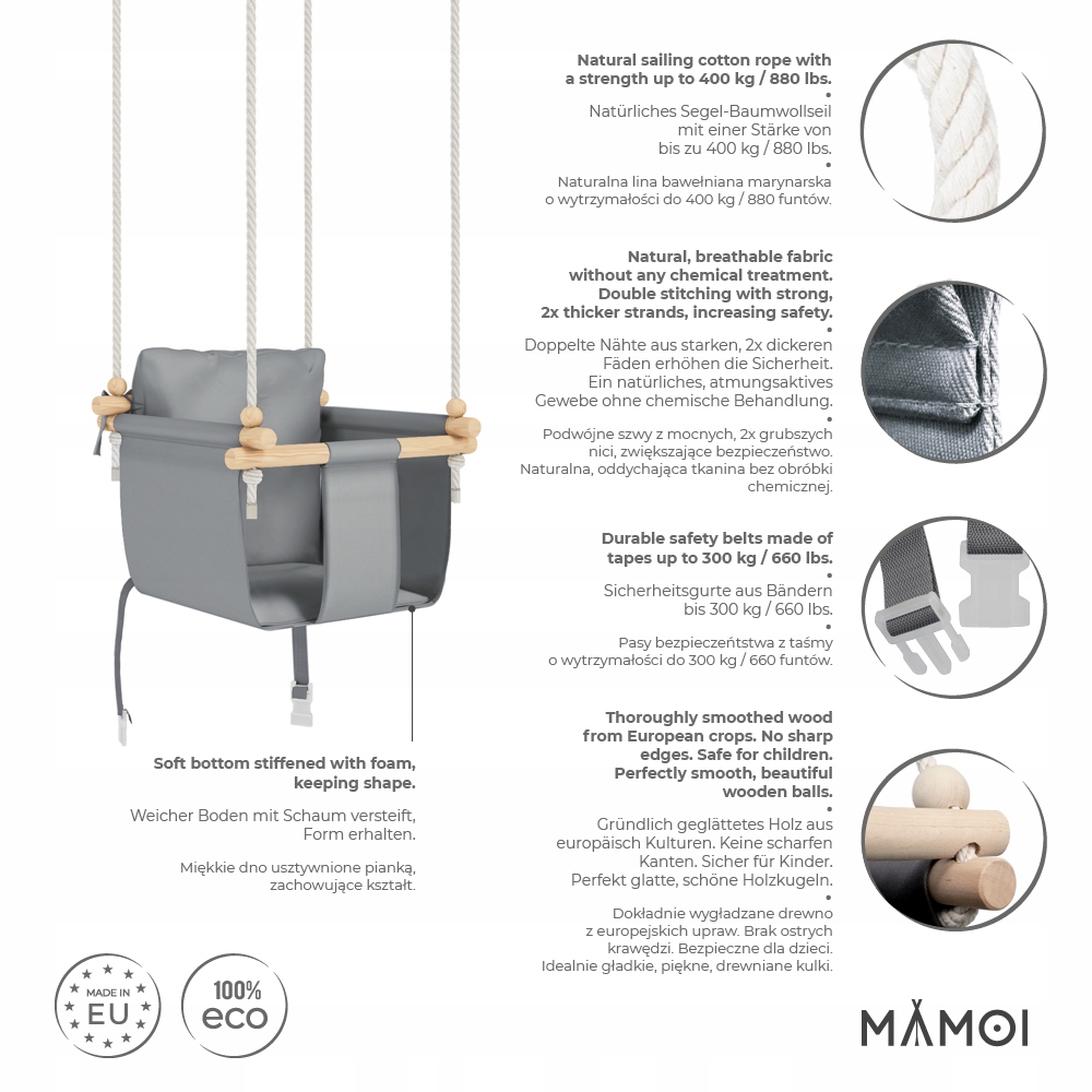 Скандинавські гойдалки MAMOI відрізняються найвищим рівнем безпеки. Крім міцного, міцного матеріалу і подвійних швів, комплект оснащений бавовняними мотузками для підвішування, міцність на розрив яких становить приблизно 400 кг. Піднята задня спинка забезпечує додатковий захист для дитини.