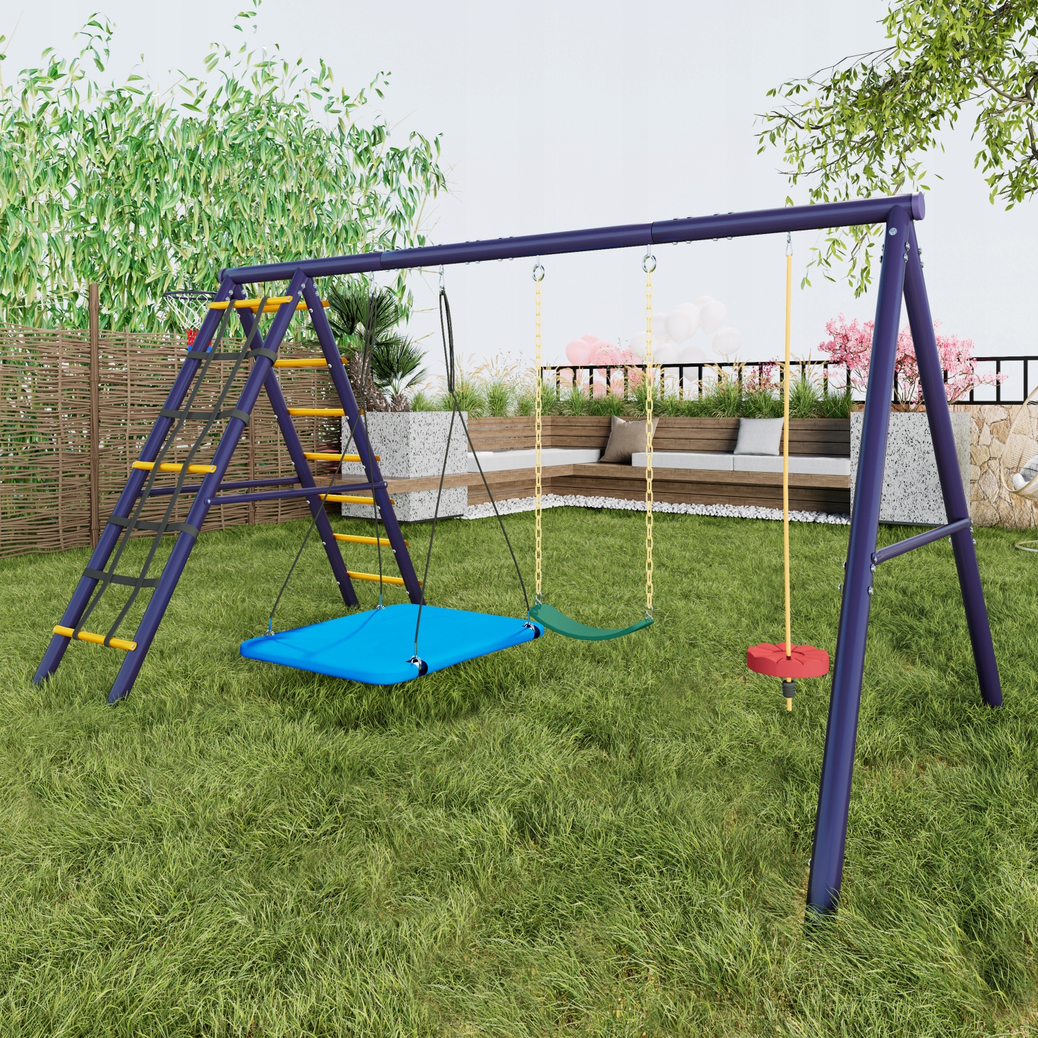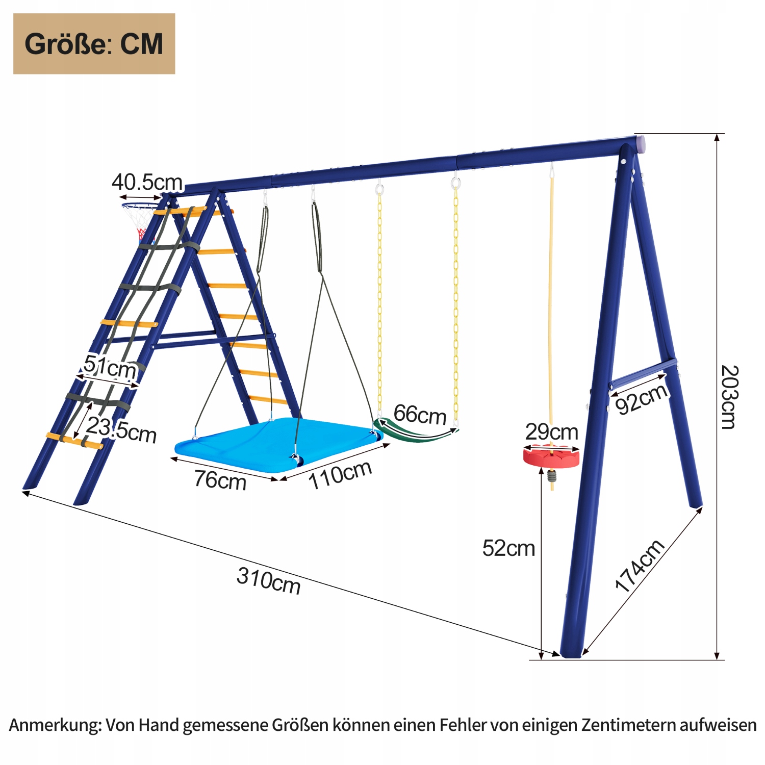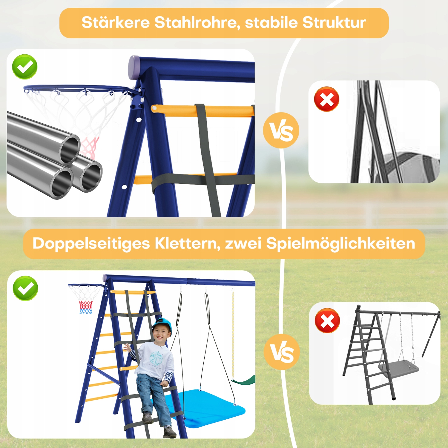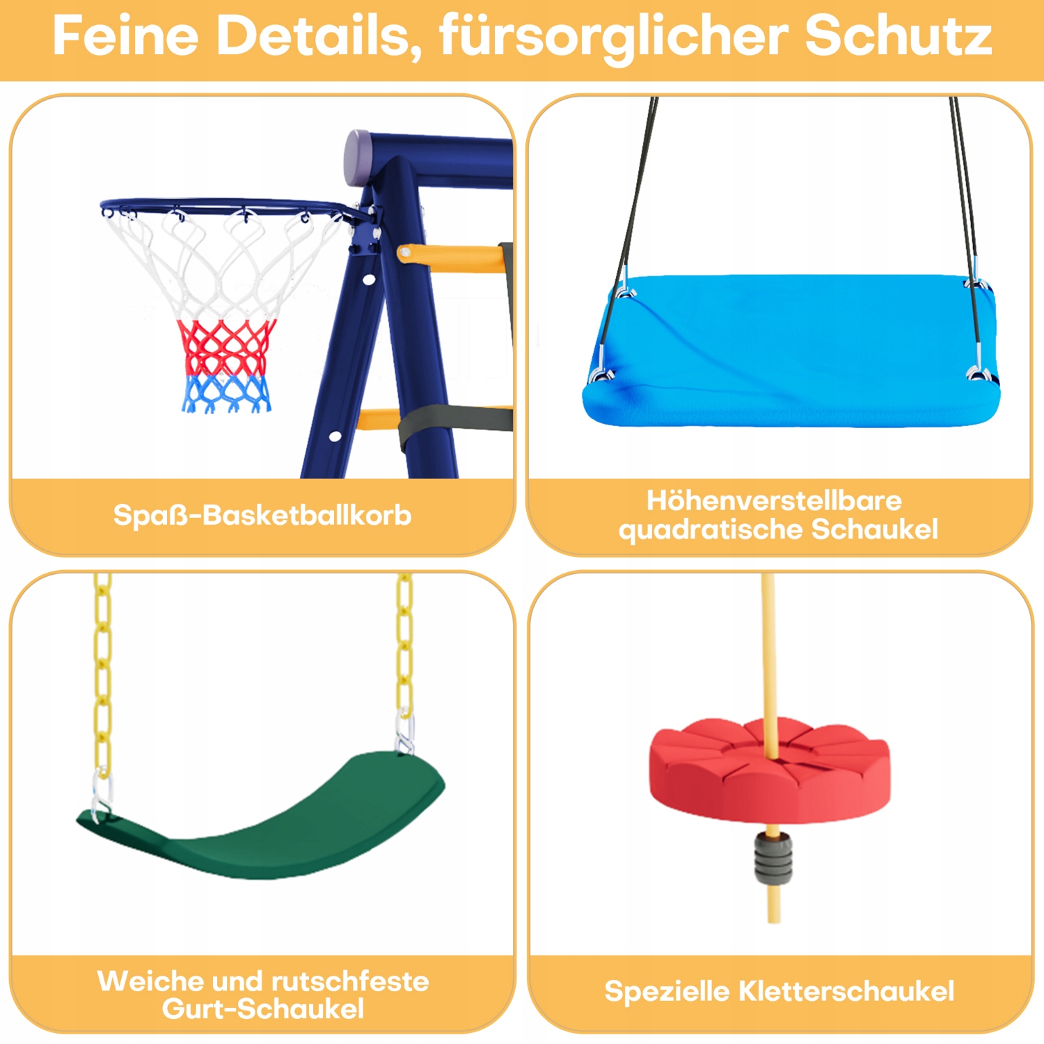 Все в одному: набір містить три гойдалки (гойдалка з висячою дошкою, гойдалкою з м'яким поясом та розгойдуванням кабелю з платформою), скелелазінням та баскетбольним кошиком, зустрічі з дитиною у польових розвагах.