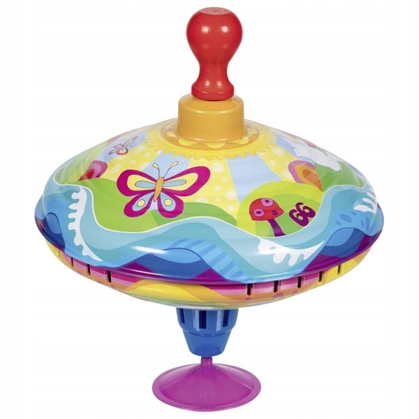 Велика металева дзига — це традиційна іграшка, яку люблять маленькі діти. Тепер у барвистій версії прямо з 1960-х років. Коли ви обертаєте його, кольори зливаються, створюючи візуальну веселку, яка обертається. На відміну від традиційних дзиг, ця дзига має основу внизу. Завдяки цьому він стоїть на ньому стійко і не перекидається. Просто почніть натискати на верхню дерев’яну паличку, і вся ця штука почне обертатися та видаватиме специфічний, але приємний звук.