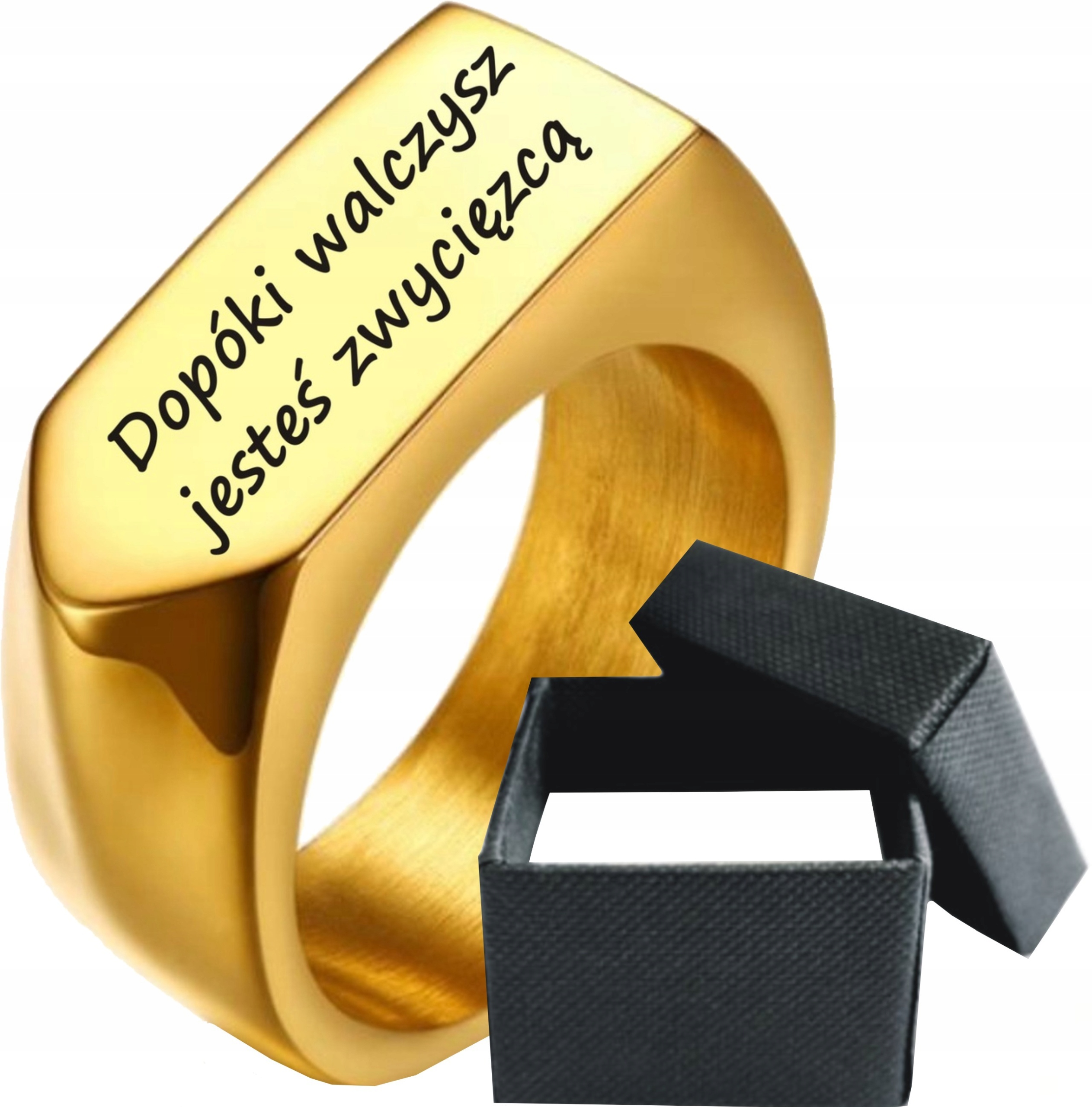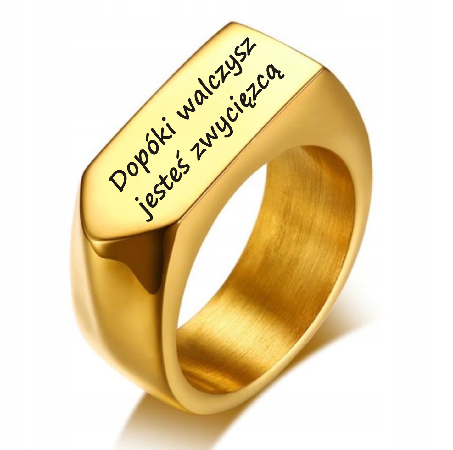 Елегантний, стильний перстень з печаткою з високоякісної нержавіючої сталі 316L, також відомої як нержавіюча сталь, ювелірна сталь або сталь хірургічна. Центральна частина виробу має стрілоподібну форму, з плавно закругленими кутами - ця поверхня адаптована для персоналізації, шляхом виконання індивідуального гравіювання, якими може бути напис, логотип, зображення тощо. Каблучка з печаткою має блискучу, поліровану глянсову поверхню, що робить її дуже елегантною. Крім того, колір золота 18k зумовлений міцним IP покриттям. Внутрішнє покриття має матове/матове покриття. Ідеально підходить для людей, які цінують класику та елегантність. Унікальний візерунок, що привертає увагу. Виріб виготовлено з надзвичайною ретельністю та увагою до деталей з матеріалів найвищої якості. Ідеально відполірована, внутрішня частина виконана таким чином, щоб підвищити комфорт використання виробу. Обручка також є ідеєю ідеального подарунка.