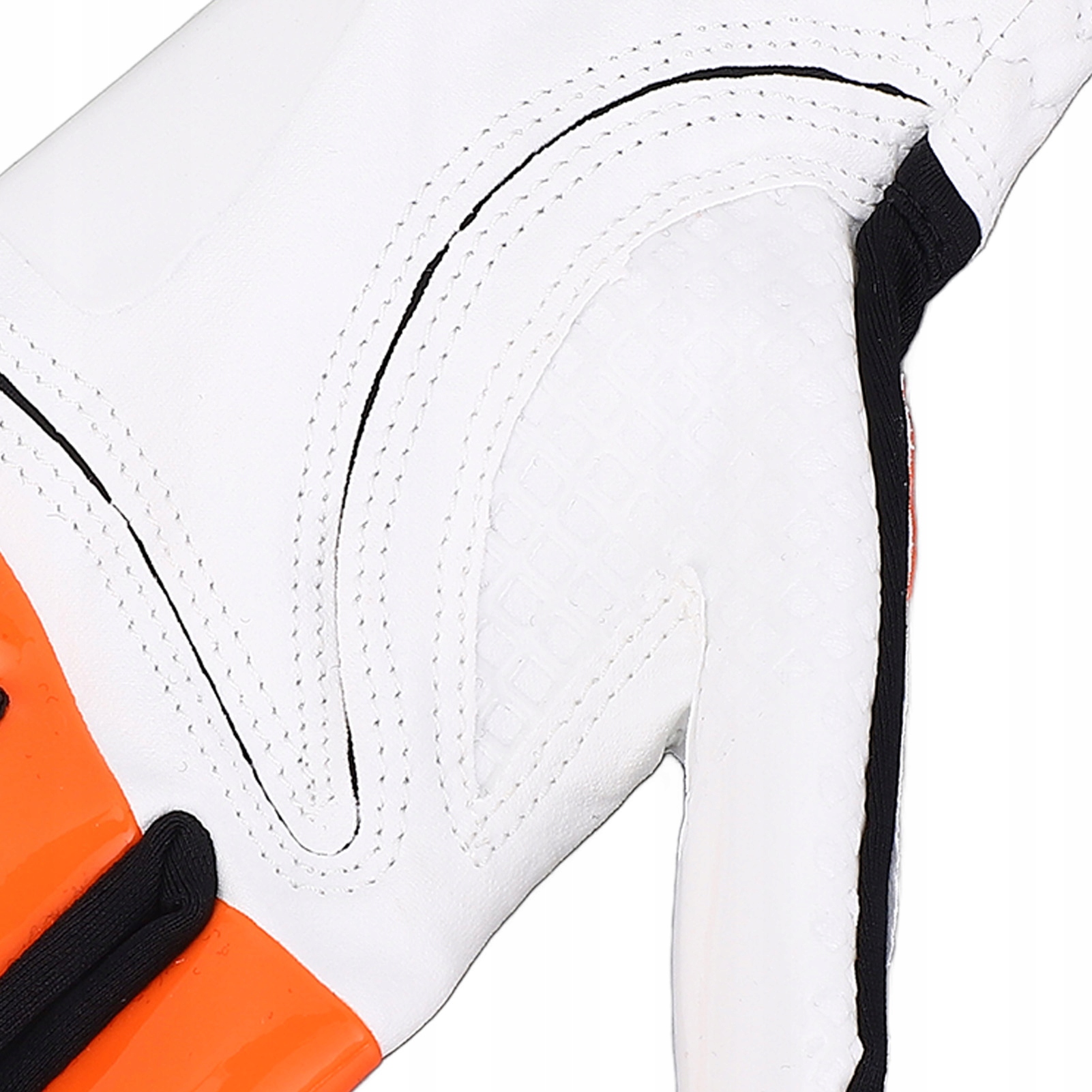 3. Помаранчевий силіконовий область: Внутрішня частина рукавички має помаранчеву силіконову зону, гарантуючи, що гольф -клуб залишається сильно в руці, зменшуючи ковзання та підтримку точності