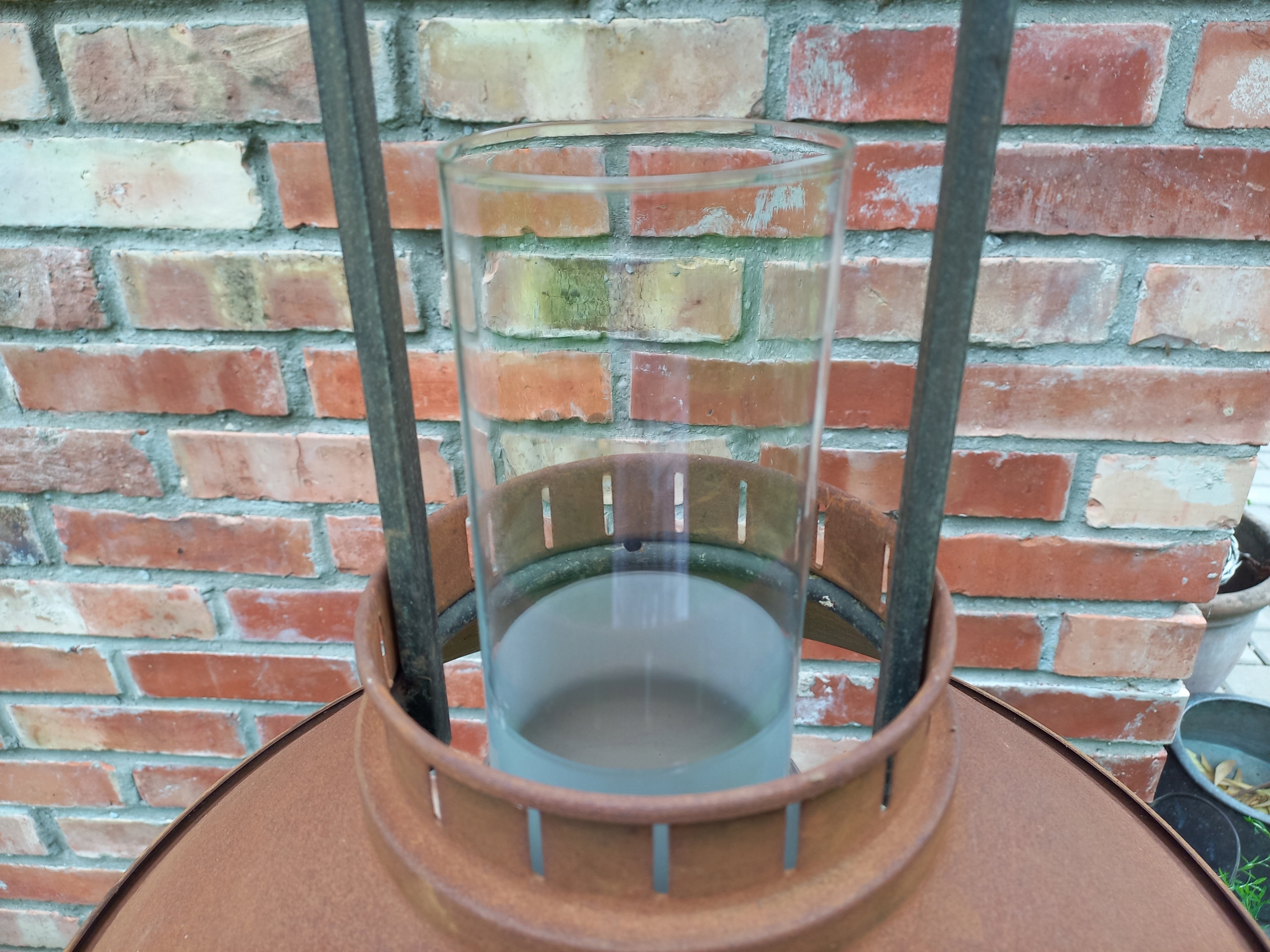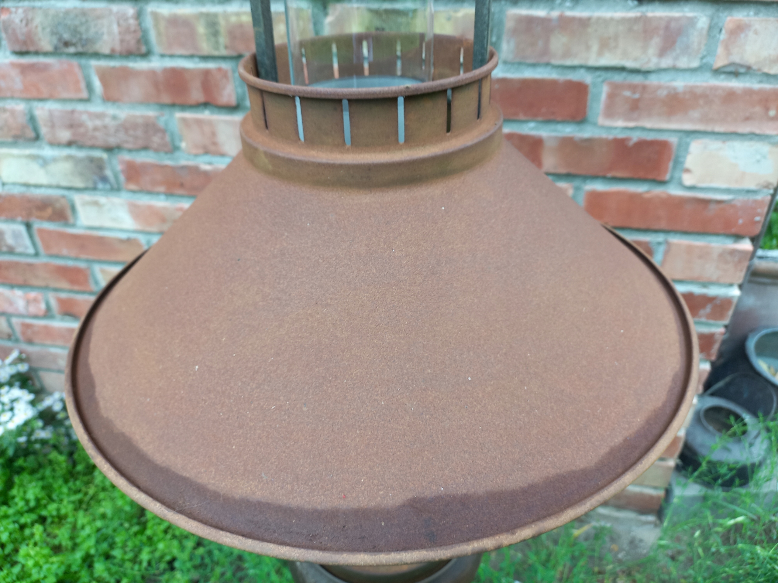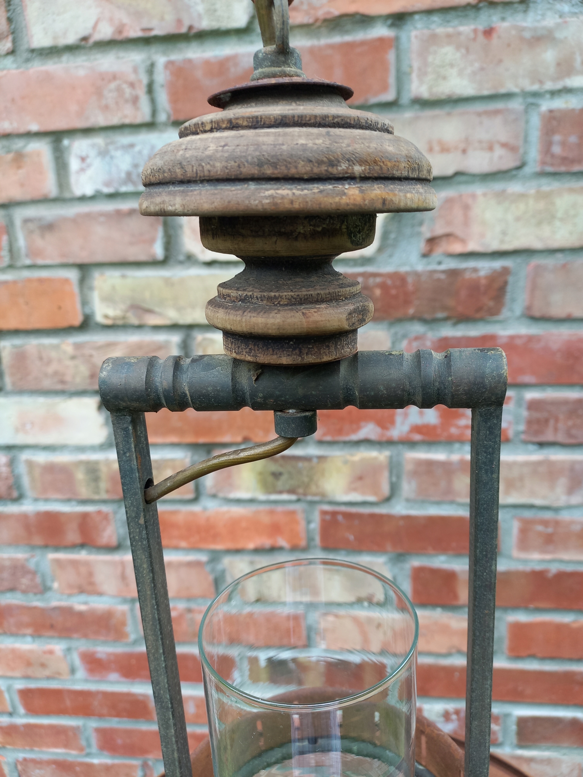 Тема моєї пропозиції - люстра з дерева та металу. Прозорий скляний камін розміщений посередині. У деяких місцях є сліди проходження часу, показаного на знімках. Металева ламп та деякі металеві деталі - іржаві. Електрична установка функціональна.