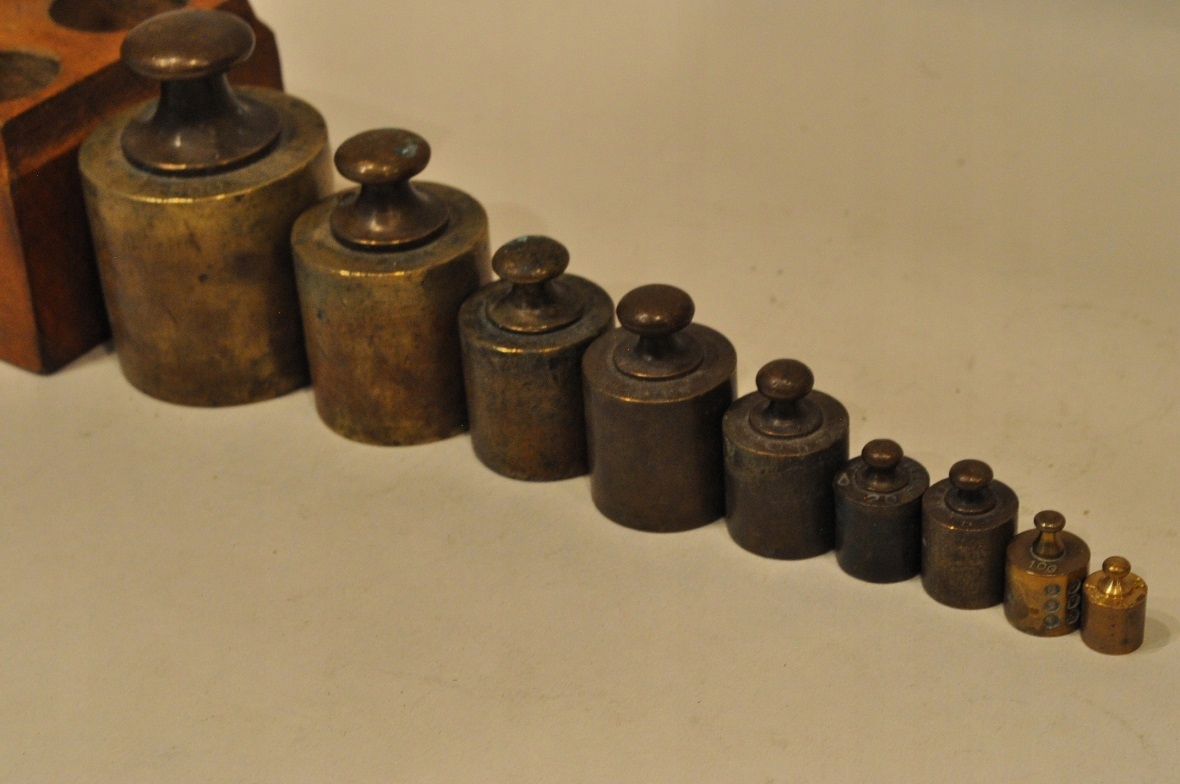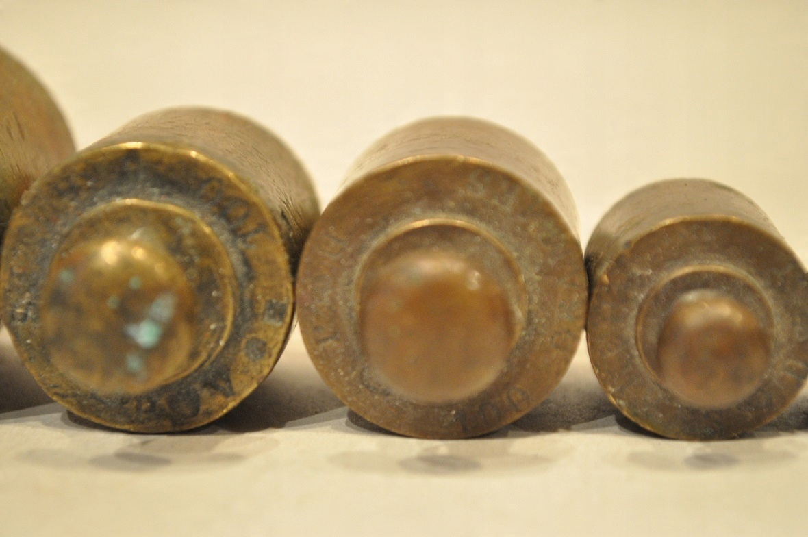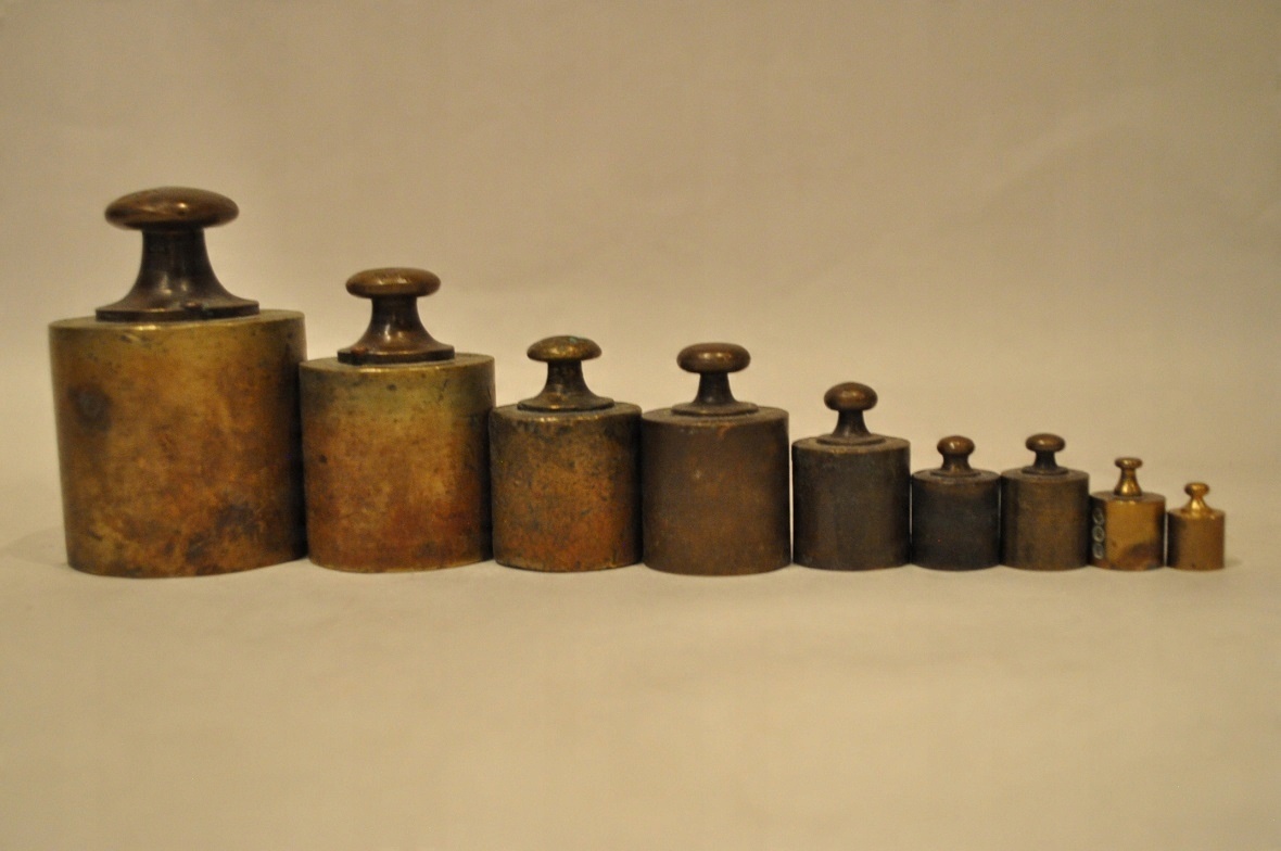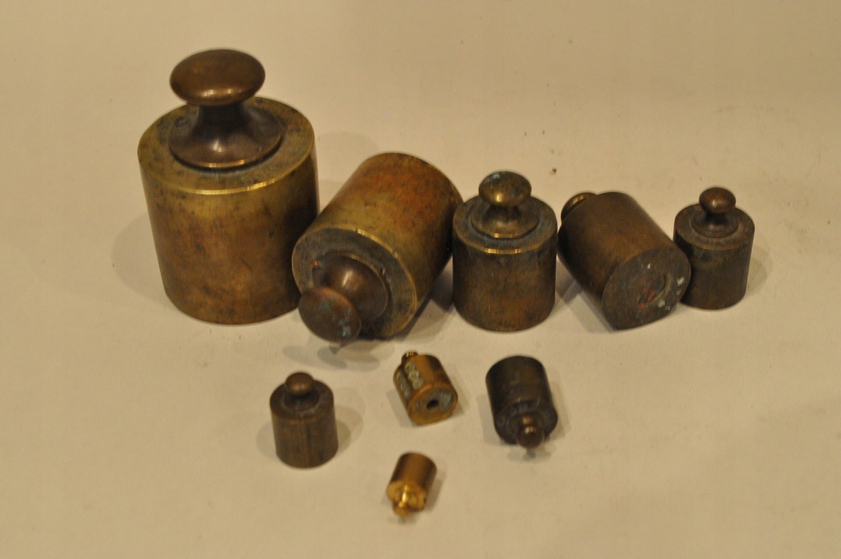 Окрім двох найменших гир - бронзи, неочищеної латуні - покритої оригінальною, старою, темною патиною.