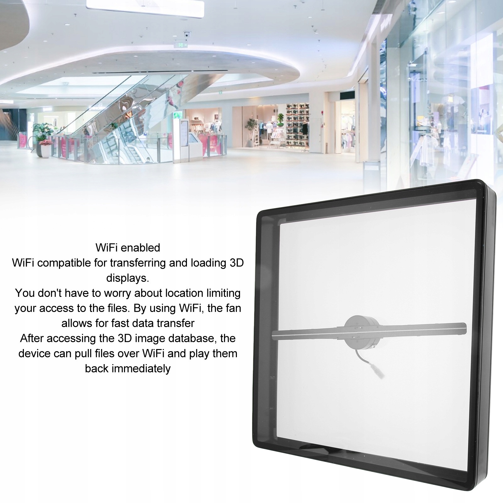 4. Застосування ширини: 3D -проектор голограми підходить для магазинів, супермаркетів, офісів, ринків, торгових центрів, кольорових магазинів, ресторанів, ювелірних магазинів та інших торгових точок. 4 Вам не потрібно турбуватися про обмеження доступу до файлів. За допомогою Wi -fi вентилятор дозволяє швидко передавати дані. Після доступу до бази даних 3D -зображень пристрій може завантажити файли на Wi -ifi та відтворювати їх негайно.
