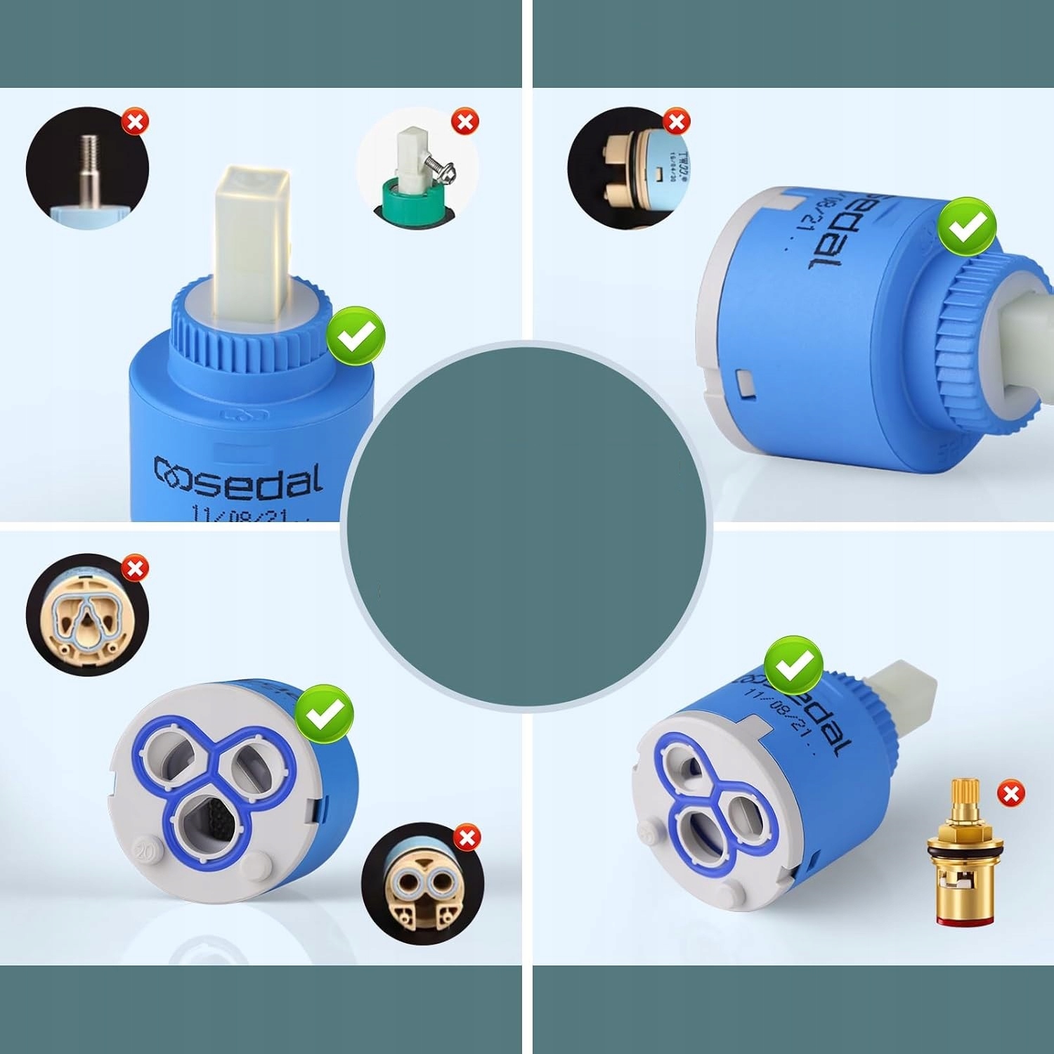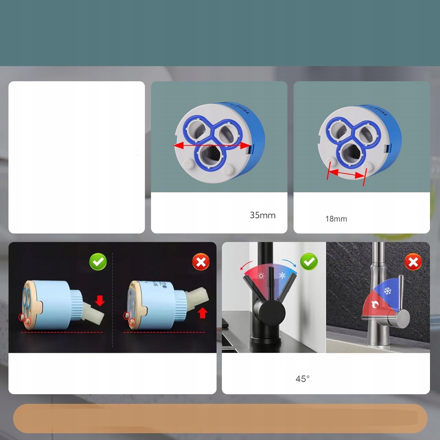 - Застосування: Пропонована керамічна вставка діаметром 35 мм (плоска ніжка) сумісна з більшістю одноважільних змішувачів для кухні та умивальника, які використовують вставки 35 мм.