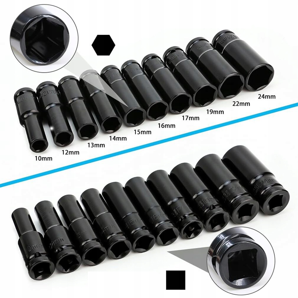 Метричні ударні головки глибиною 10 1/2 дюйма: 10-12-13-14-15-16-17-19-22-24 мм, глибина ударної головки: 78 мм, відповідає всім потребам і сценаріям використання. Кожен розмір надруковано на шестигранній гнізді, щоб ви могли легко визначити гніздо, коли дістаєте його з коробки.