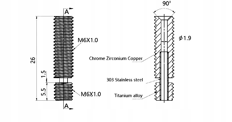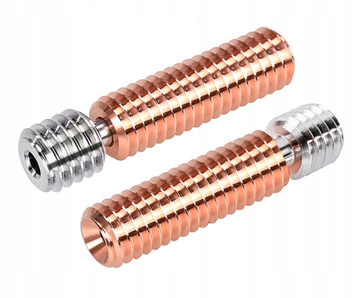 Починаючи з використовуваного матеріалу - БІМЕТАЛ - титан плюс модифікована мідь, через якість виготовлення - точно зроблений терморозрив на межі двох ниток (вкручена в радіатор - мідна, вкручена в нагрівальний куб - ТИТАНОВА), що закінчується помітно зменшеною вагою (масою) цілого, що впливає на інерцію головки, а отже, на точність друку на підвищених швидкостях.