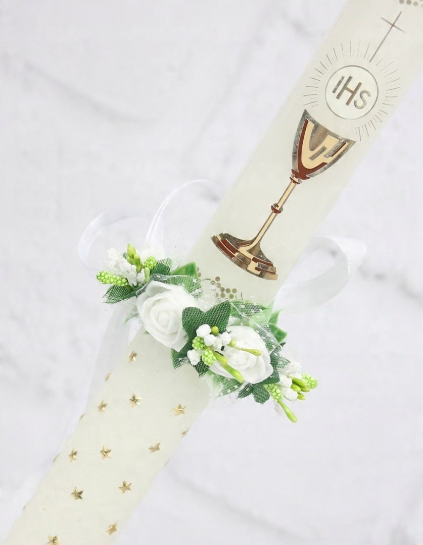 Ніжна та красива прикраса для свічки для причастя в стилі бохо, повна білих троянд, загорнутих у шифон, прикрашена листям плюща, що нагадують серця та перлини.