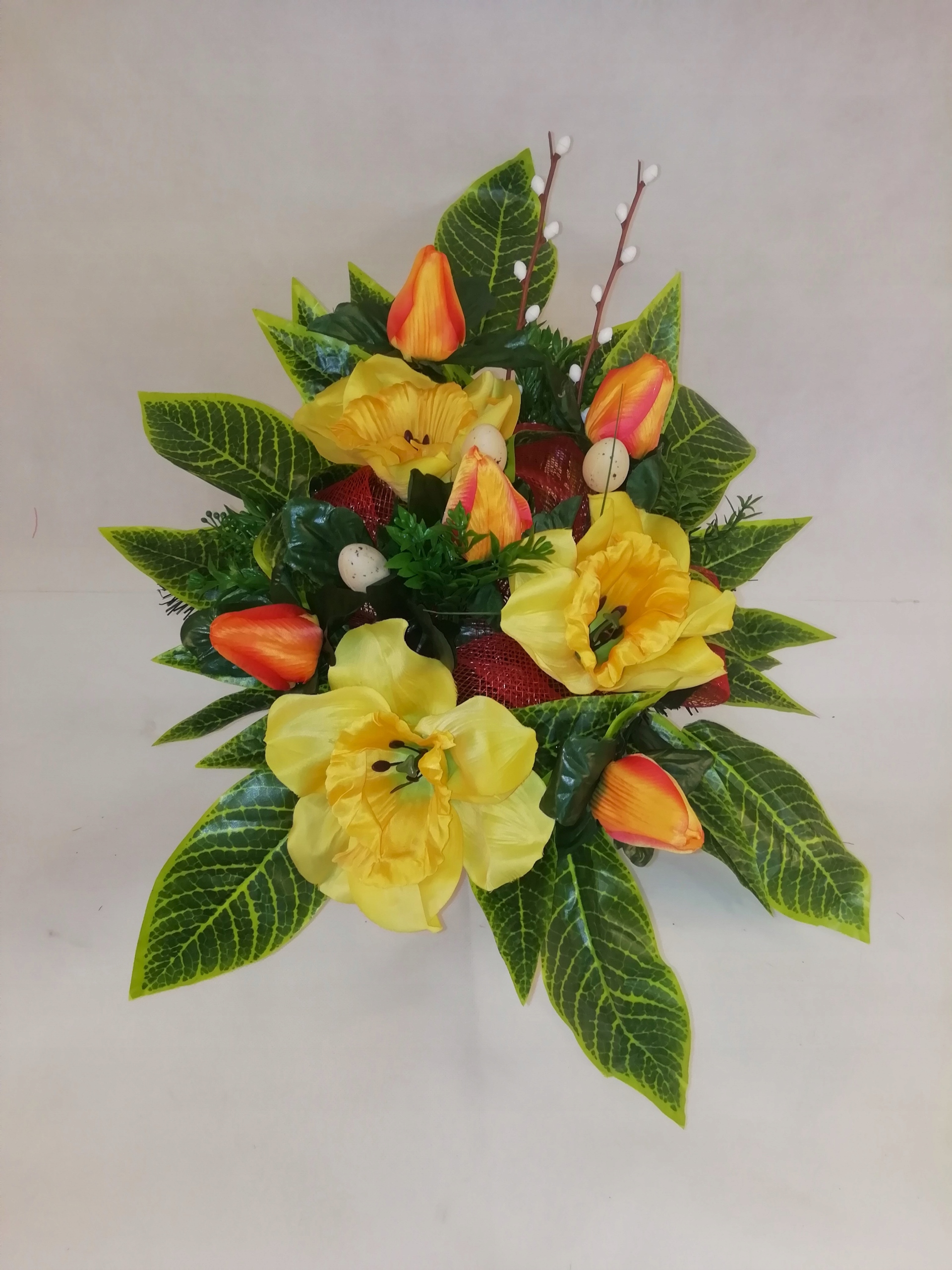 Композиція виготовлена з штучні квіти, все заповнене листям та аксесуарами
