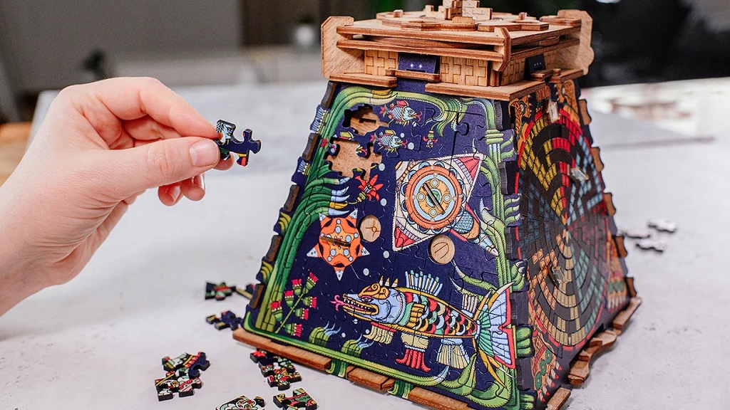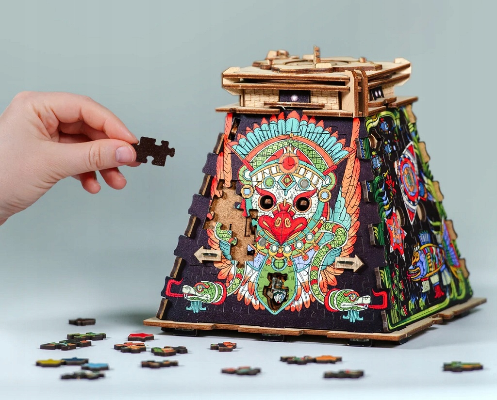 Ти любиш головоломки, головоломки, ребуси і загадки? Хочеш зробити подарунок близькій тобі людині? Тоді ця головоломка у формі ацтекської піраміди вам точно сподобається. Головоломка поєднує традиційні головоломки з викликами гри-втечі. Правильно розташуйте понад 200 частин головоломки, знайдіть приховані підказки та вирішуйте логічні завдання, щоб відкрити механічні замки цієї містичної скриньки. Головоломка сама по собі є надзвичайним подарунком, і ви також можете помістити всередину особисте повідомлення, ювелірні вироби або інший дрібний предмет. Одержувачу буде нелегко! Щоб дістатися до подарунка і відкрити коробку, він повинен правильно розставити всі частини пазла і розгадати загадки. Головоломка виготовлена вручну з дерева, і завдяки якісній та акуратній виготовленні та ілюстраціям Стіва Сімпсона та Хоакіна Нави вона підійде як подарунок чи прикраса. Якщо вам подобаються випробування та зміни, ви можете придбати додатковий набір головоломок на бокових стінках, щоб надати вашій піраміді новий вигляд (ID5021 або ID5020). Основні характеристики: підходить як подарунок або прикраса, час гри від 90 до 120 хвилин, для 1 або 2 гравців, з внутрішнім простором для невеликого подарунка, ручна робота з дерева, ілюстрації Стіва Сімпсона та Хоакіна Нави