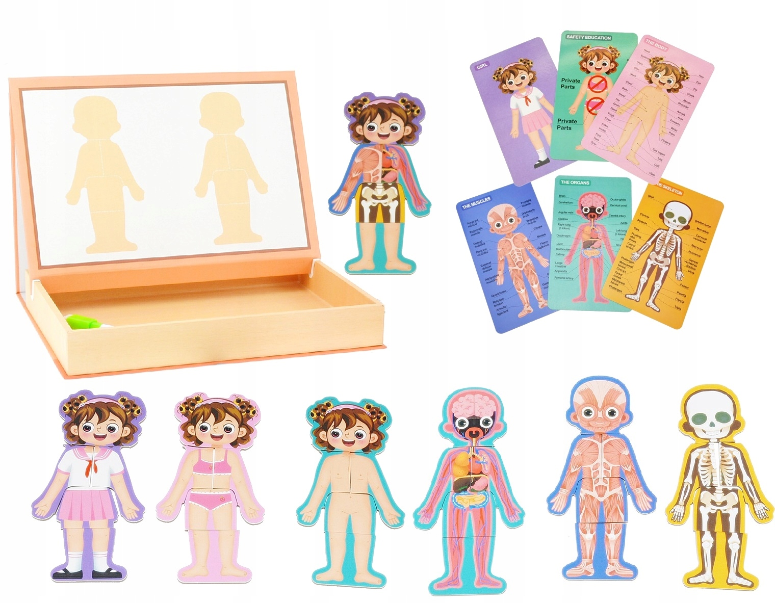 Магнітний пазл «Тіло дівчинки» — навчальний набір, який дозволить найменшим дітям дізнатися про будову та функціонування людського тіла. Гра містить головоломки, які крок за кроком розкривають таємниці людського тіла: скелет, органи, шкіру.