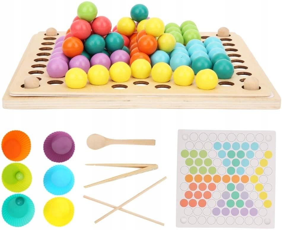 Дерев'яний пазл дозволяє самостійно конструювати та створювати красиві барвисті візерунки та цілі картинки. Гра передбачає розставляння картинок за допомогою багатьох куль різного кольору. Набір містить зразки зображень, які можна створити за допомогою елементів, що входять до набору.