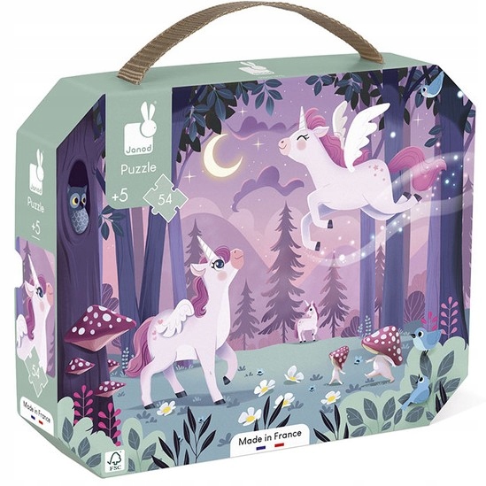 головоломка, встановлена в валізі єдинорогів французької марки Janod , складається з 54 елементів, після впорядкування прекрасної картини, що заповідає єдинорогів у вилиранні лісу. Головоломки виготовлені з суцільного картону, розробленого та виготовленого у Франції. Упакована в естетичну валізу з ручкою. Вони ідеально підходять для подарунка.