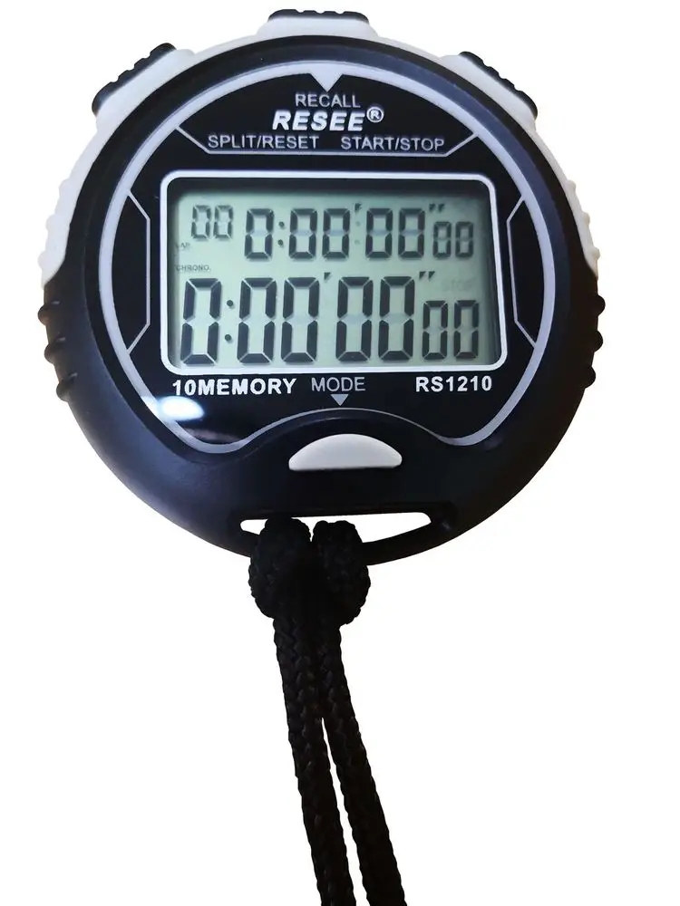 Електронний спортивний секундомір має дворядковий дисплей і функції: годинник, секундомір, будильник, дата, безперервне вимірювання в заданому інтервалі часу, контроль часу кола. Секундомір вимірює час з точністю до 1/100 секунди. Секундомір уже містить батарею.