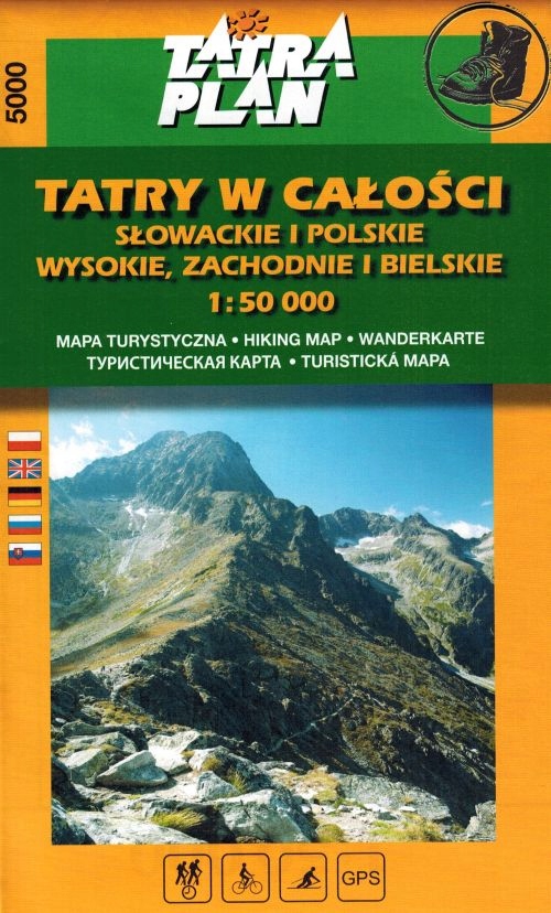 Туристична карта гір Татри на словаку та польській стороні. Він включає високий, західний та Білсько Татрас. Карта в масштабі 1: 50 000, відповідно до GPS.