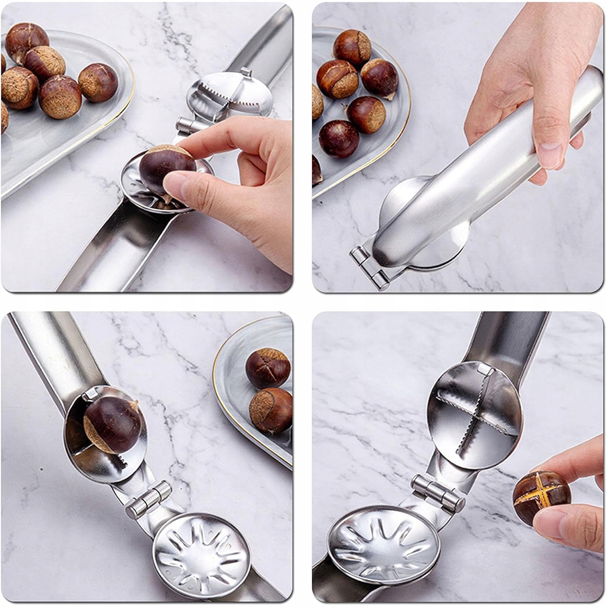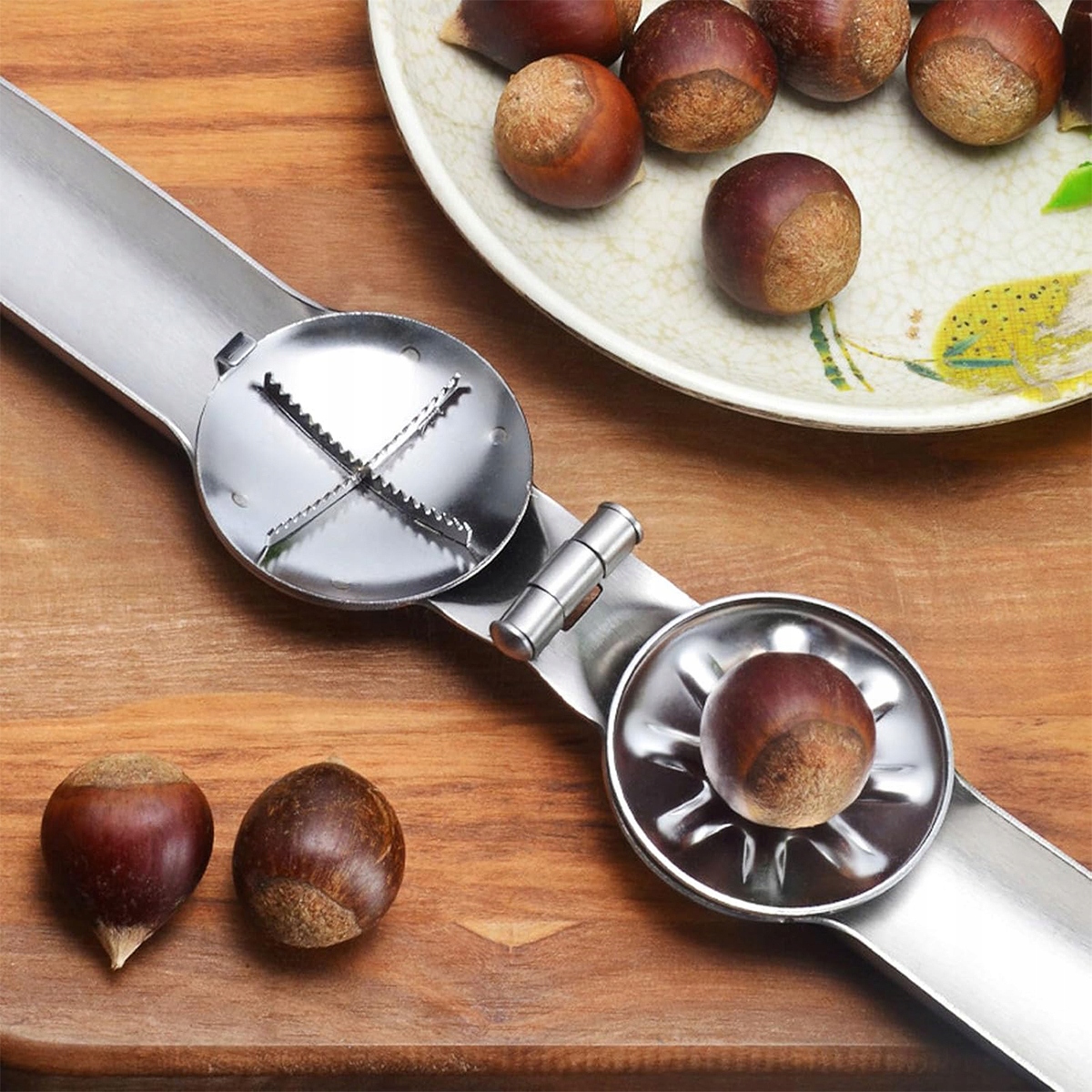 Усередині отвору є лезо у формі хреста. Зубчастий край гостріший і безпечніший. При простому натисканні каштан розкривається у формі хреста, що полегшує їжу.
