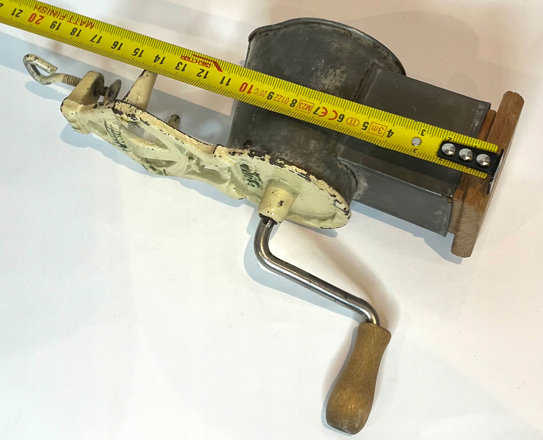 Оригінальна скандинавська м’ясорубка для горіхів 1930-1950-х років, виготовлена з чавуну/металу, пофарбована кремовим кольором. Такий тип конструкції був характерний для виробників з Данії та Швеції.