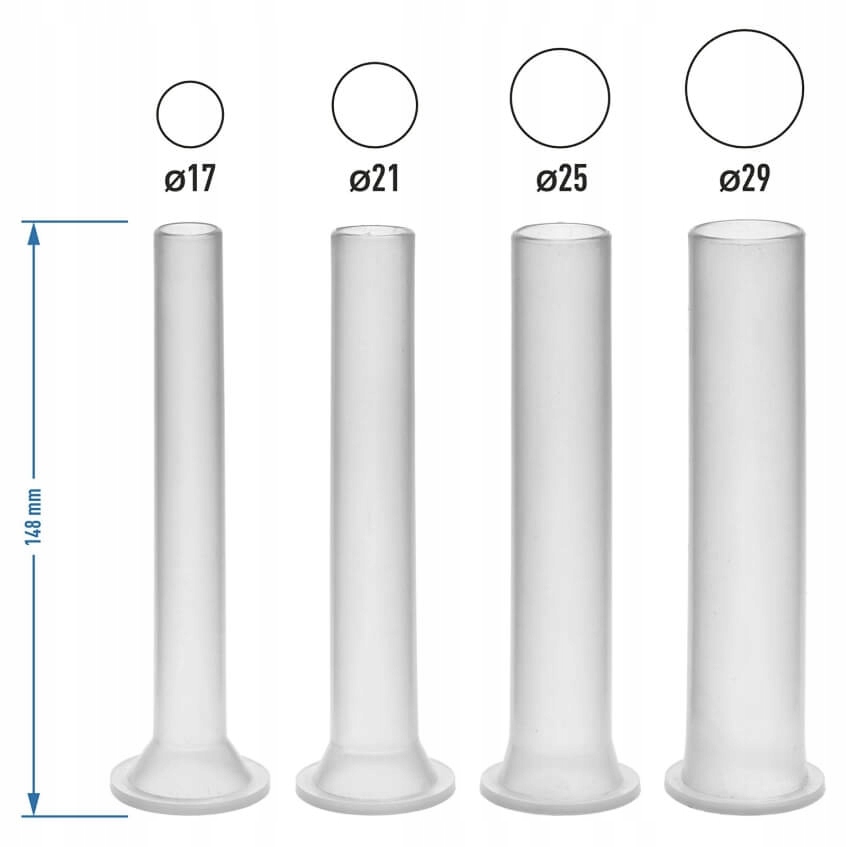 У набір входять чотири пластикові лійки з вентиляційною системою різних розмірів - діаметри: 17, 21, 25 і 29 мм.