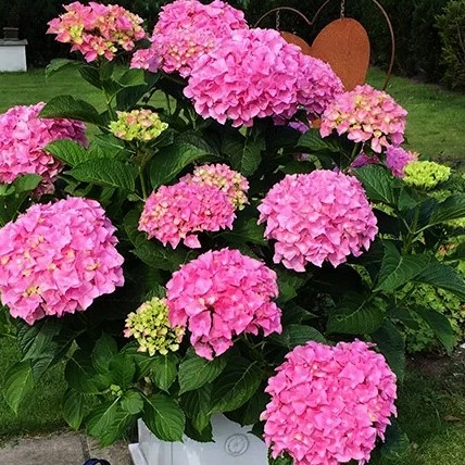 Гортензія 'Bouquet Rose' — сорт з великими кулястими рожевими суцвіттями, близько 20 см в діаметрі.
