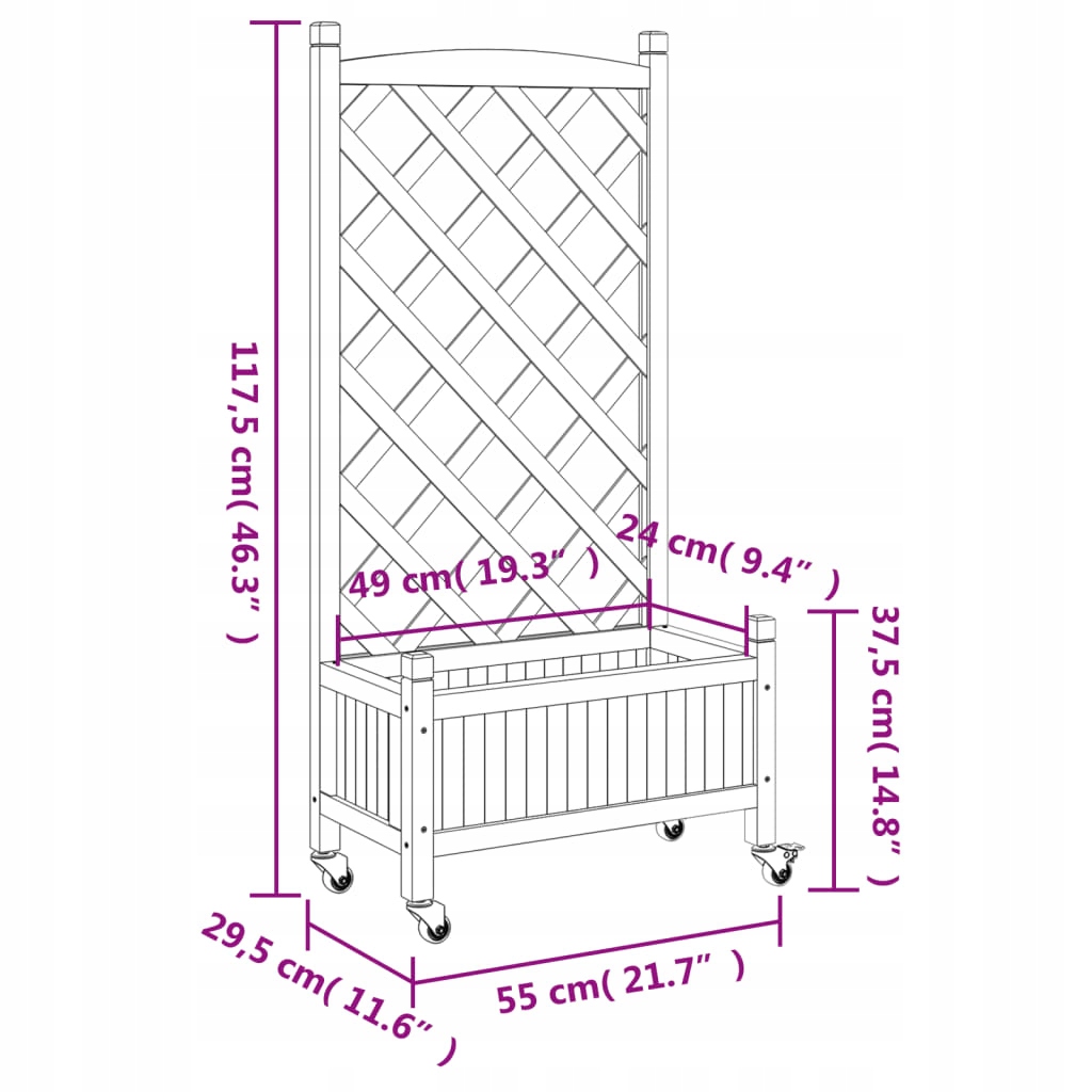 Цей дерев’яний горщик із вмістом та колесами є відмінним вибором для розведення рослин у вашому саду, на терасі та на паті. Він не сухий і спотворює, що робить його надійним вибором. Крім того, порожнисте дно забезпечує гарну вентиляцію та дренаж. Він також введе сліпуче доповнення до вашого космосу. Він може бути розміщений у кутку внутрішнього дворика, заснований на стіні або огорожі. Устілка не включається. Колеса: 3,5 см