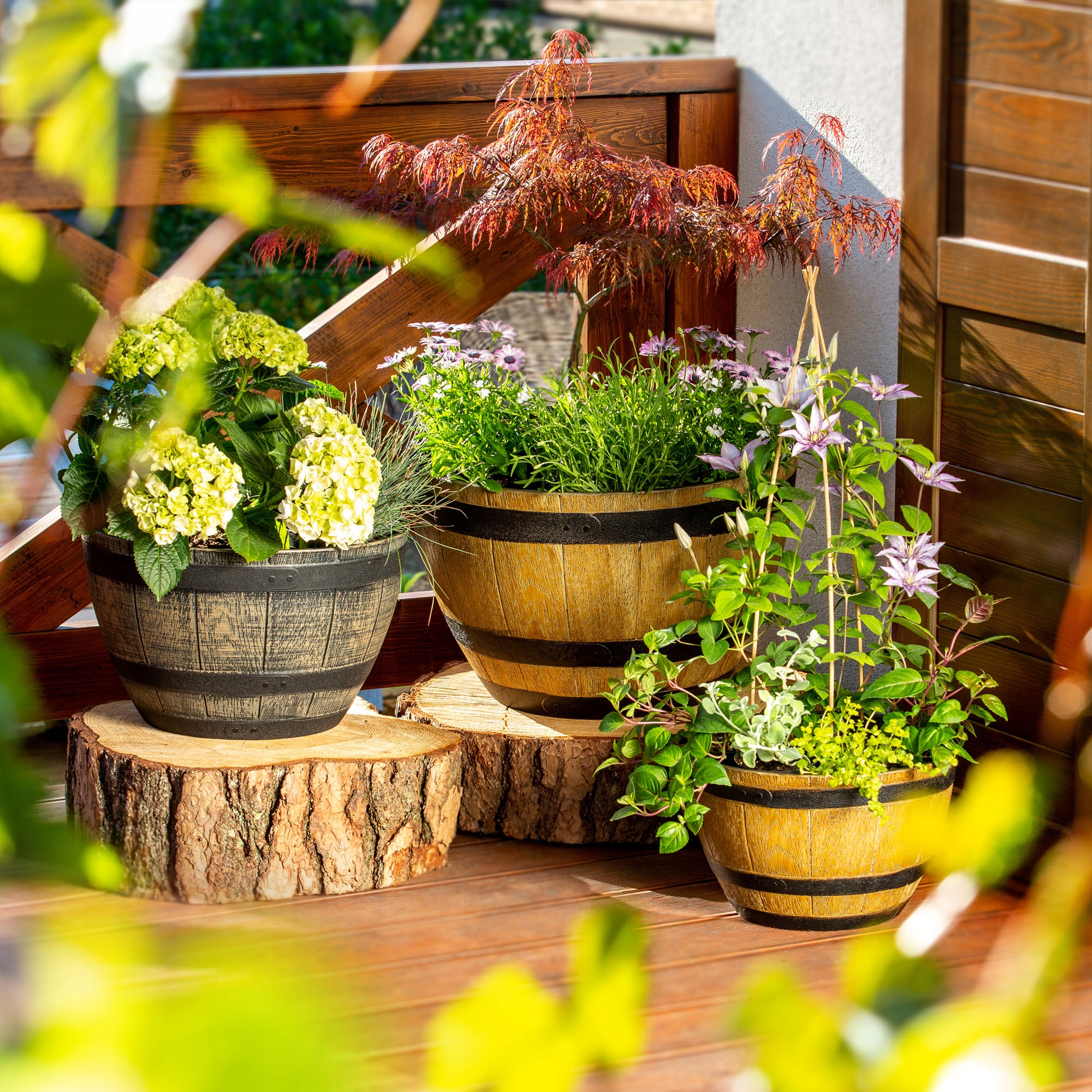 Всередині можна висадити багато різних рослин - все виглядає ефектно на фоні саду. Візерунок, що імітує дерево, надає виробу вражаючого та унікального дизайну. Вазон за формою нагадує бочку, тому він також є гарною прикрасою дому.