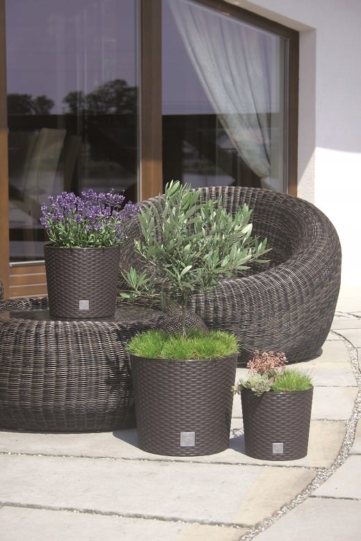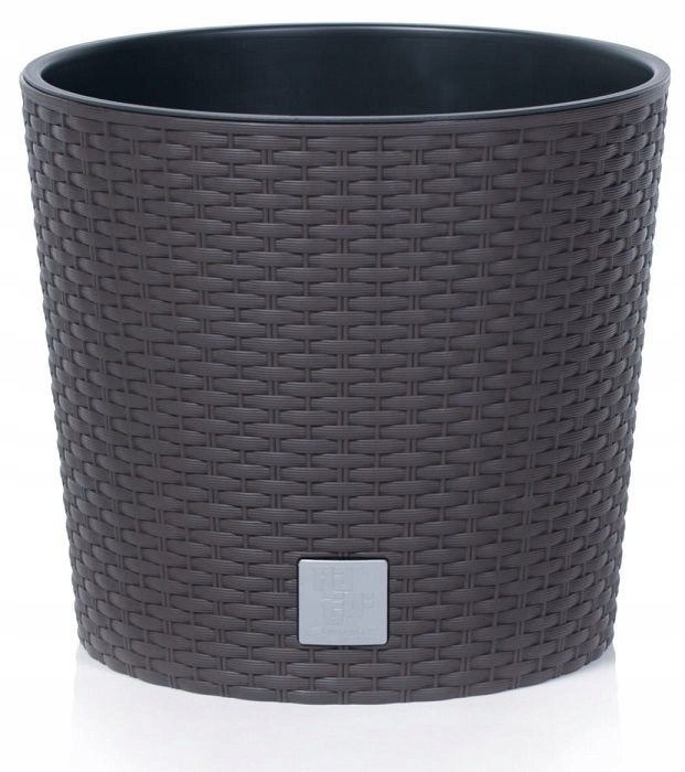 Простий круглий квітковий горщик із текстурою, що нагадує ротангову плетінку. Нанесений емблемою колекції RATO. Поставляється зі спеціальною вставкою.
