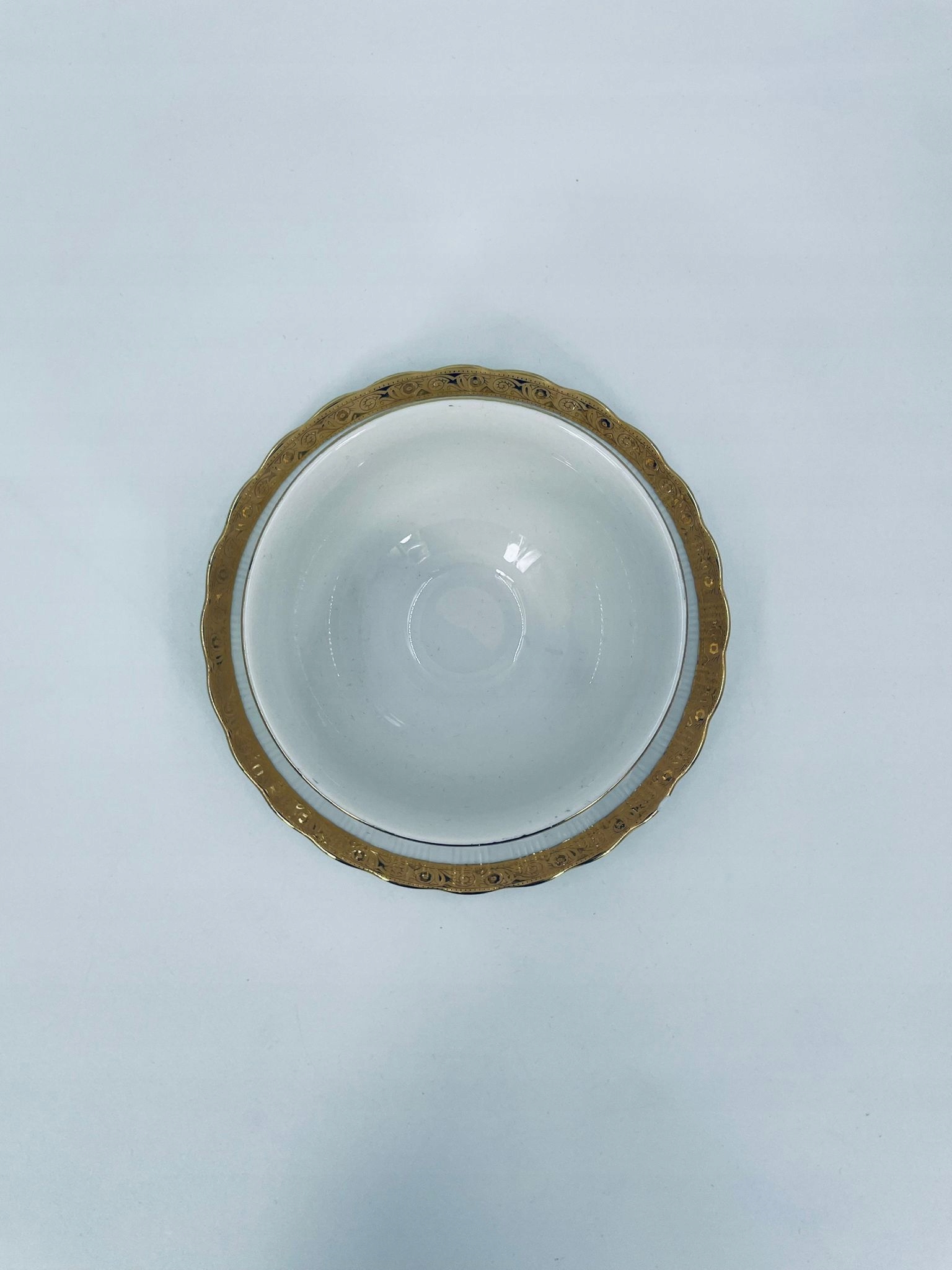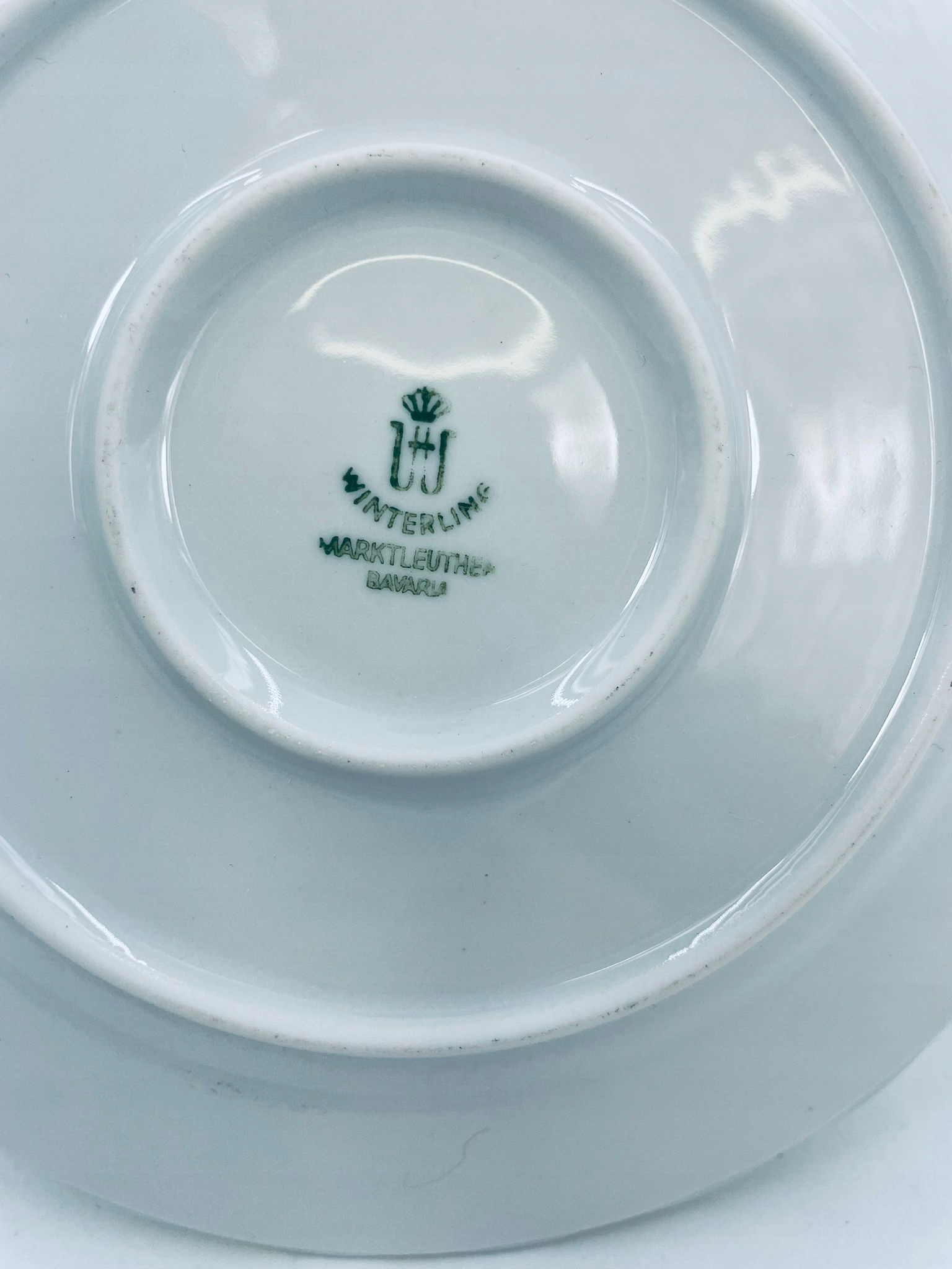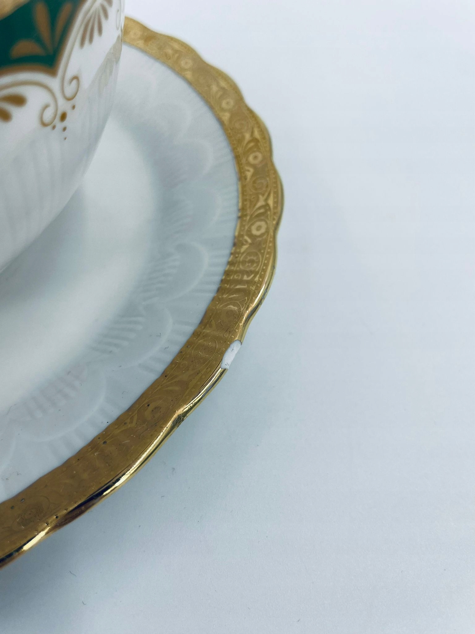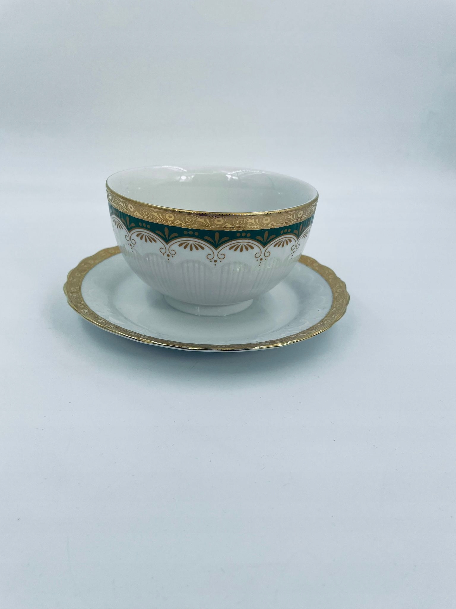 Чашка для бульйону Winterling Marktleuthen з підставкою, виготовлена з високоякісної білої порцеляни. Для бульйону характерна багато декорована окантовка зеленого та золотого кольорів із золотистими візерунками. Має потертості та пошкодження позолоти.