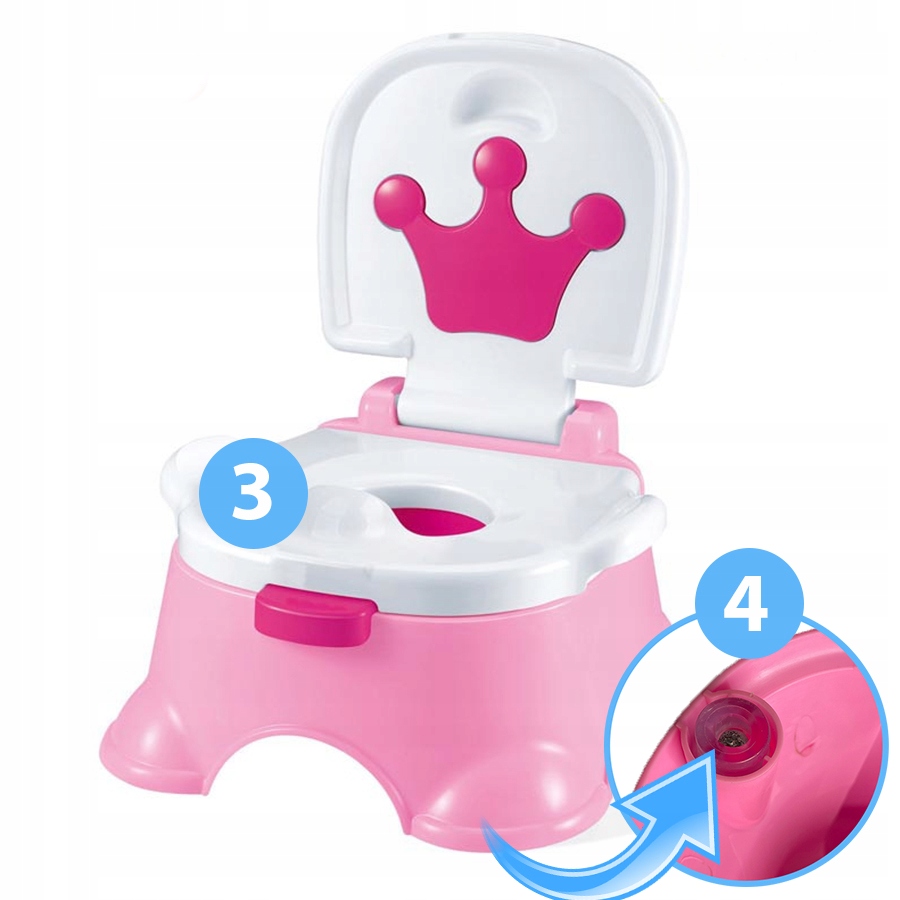 Новий королівський тронний горщик із короною можна використовувати по-різному – він просто багатофункціональний. Його основною функцією є, звичайно, навчитися самостійно користуватися туалетом (1), але з часом його можна використовувати як підніжку (2)і як кришка сидіння унітазу (3) завдяки знімному сидінню з горщика. Його наступна роль — просто звичайний табурет вантажопідйомністю до 90 кг (4).