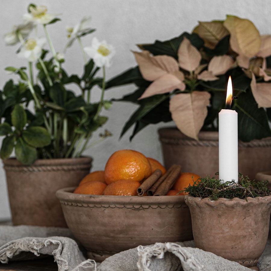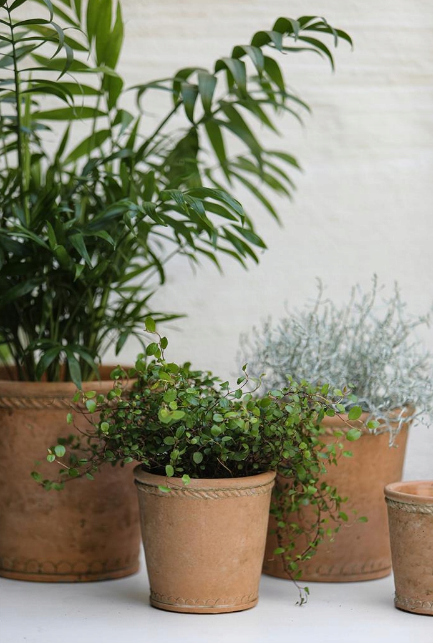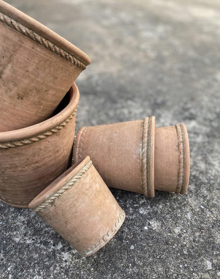 Квітковий горщик із сільського цементу теракотового кольору та натуральної землі. Декоративні прикраси по верхньому краю кришки і в основі стануть приємним акцентом в будь-якій кімнаті або саду. Цей невеликий горщик також підійде не лише як горщик для квітів чи зелених рослин, але й для таких трав, як базилік, м’ята чи коріандр.