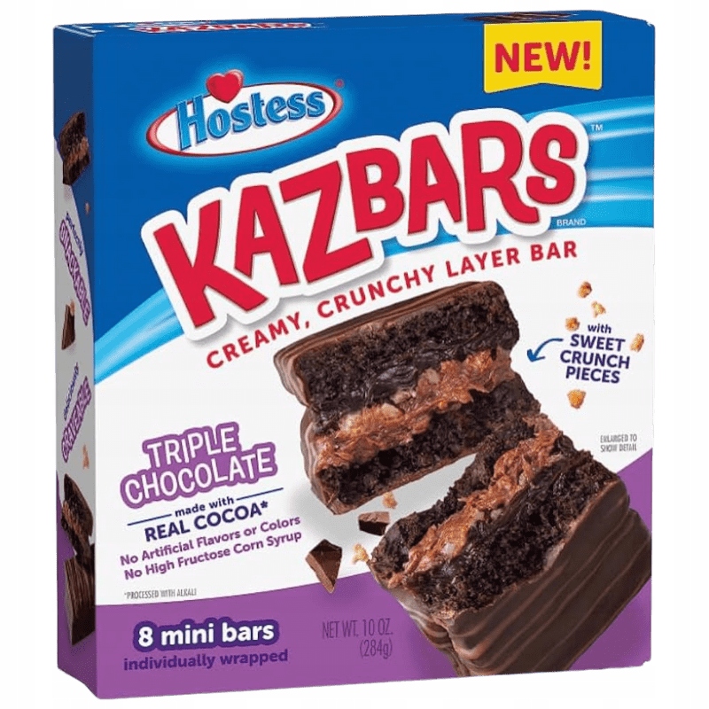 Hostess Kazbars Triple Chocolate – справжній хіт у США, його люблять любителі шоколаду. Це більше, ніж просто звичайний батончик – це печиво, повне смакових сюрпризів, яке дивує вас з кожним шматком. Торгова марка Hostess вже багато років пропонує унікальні солодощі, і потрійний шоколад Kazbars не став винятком. Кожен батончик складається з кількох ідеально скомпонованих шарів: м’який шоколадний торт, густий крем і хрусткі добавки, вкриті насиченим шоколадом.