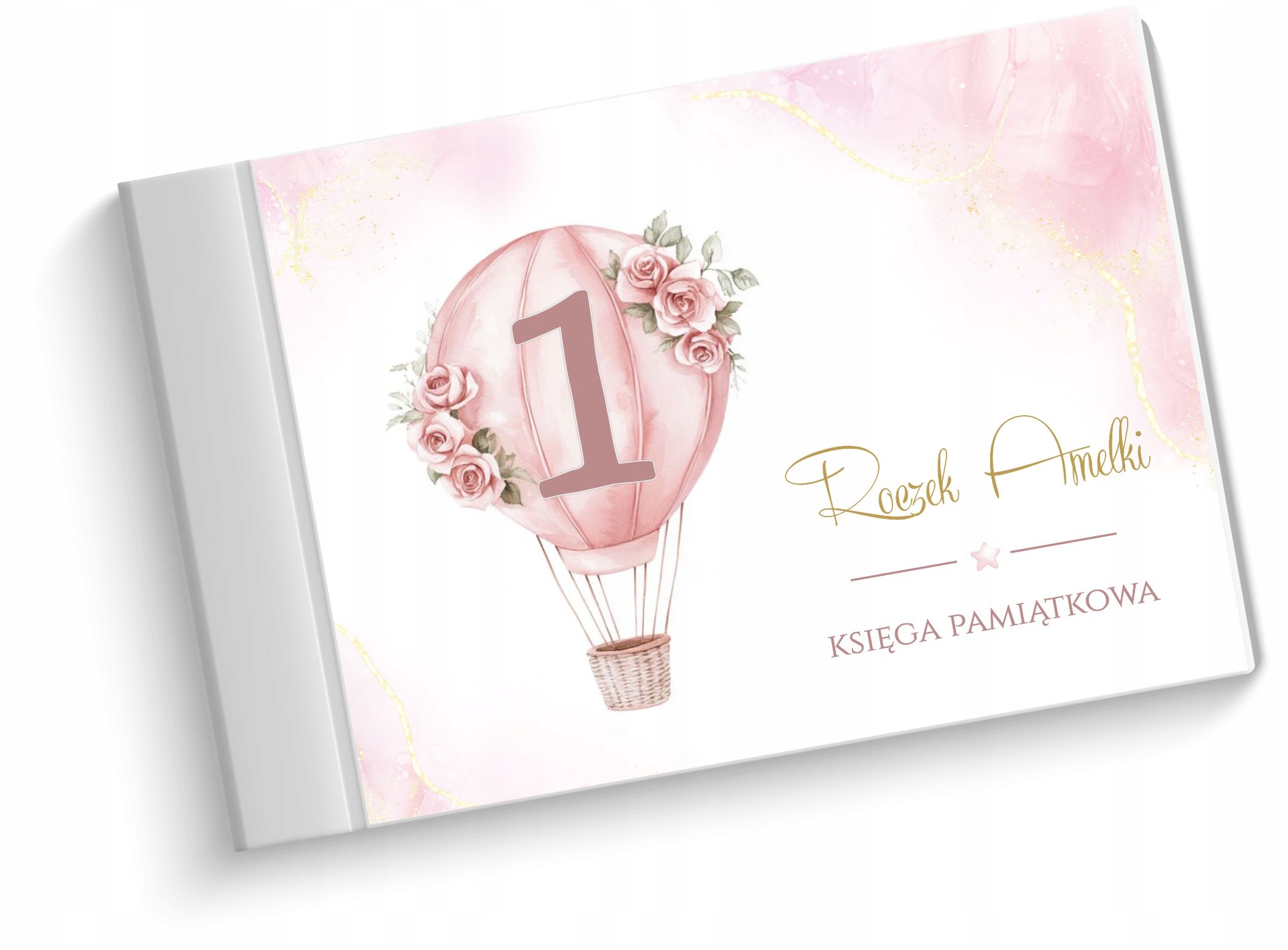 Книга для сувенірних записів з побажаннями від гостей. Виготовлено в твердій білій обкладинці, прикрашеній наклейкою з рожевою аквареллю та малюнком повітряних куль.