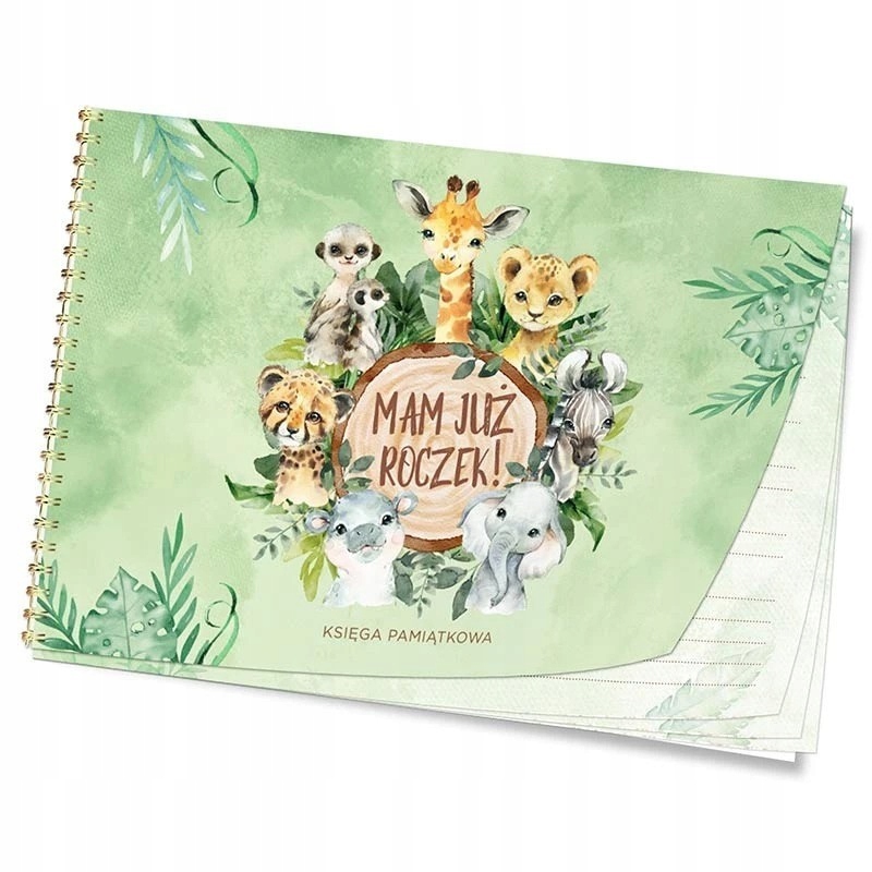 Річна пам'ятна книга з анкетами всередині та місцем для розміщення записів про гостей — це фантастична ідея, щоб зачарувати малюка та його батьків. Книжка містить картки, розміщені на декоративній золотистій спіралі. Яскрава і насичена обкладинка з зображенням тварин виглядає красиво і неповторно. Все це стане гарним сувеніром на перший день народження дитини.