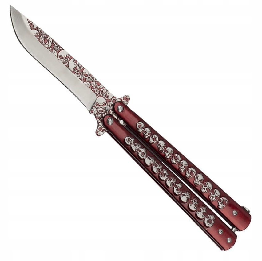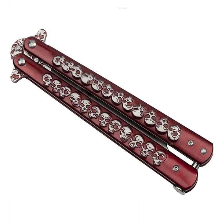 Металева рукоятка червоного металічного кольору , має класичну для ножів форму леза-метелика.