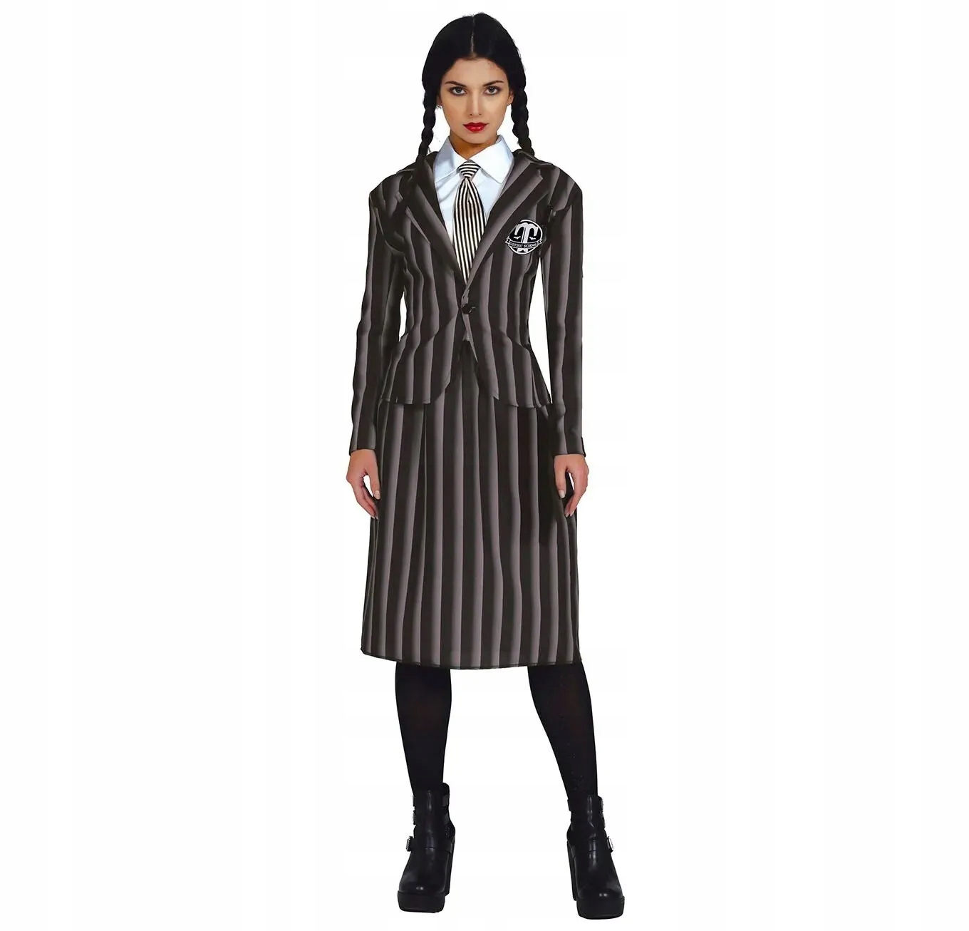Надзвичайно інтригуючий костюм готичного студента, який черпає натхнення з персонажа Венсді Аддамс. Він складається з білої сорочки з краваткою, чорно-білої смугастої спідниці та чорно-білого піджака. Вбрання поєднує в собі елементи елегантності та темної естетики. Виготовлений з високоякісного поліестеру, що гарантує довговічність і комфорт. У ньому ви можете зіграти роль готичного студента в стилі Венсді Аддамс на різних тематичних вечірках.