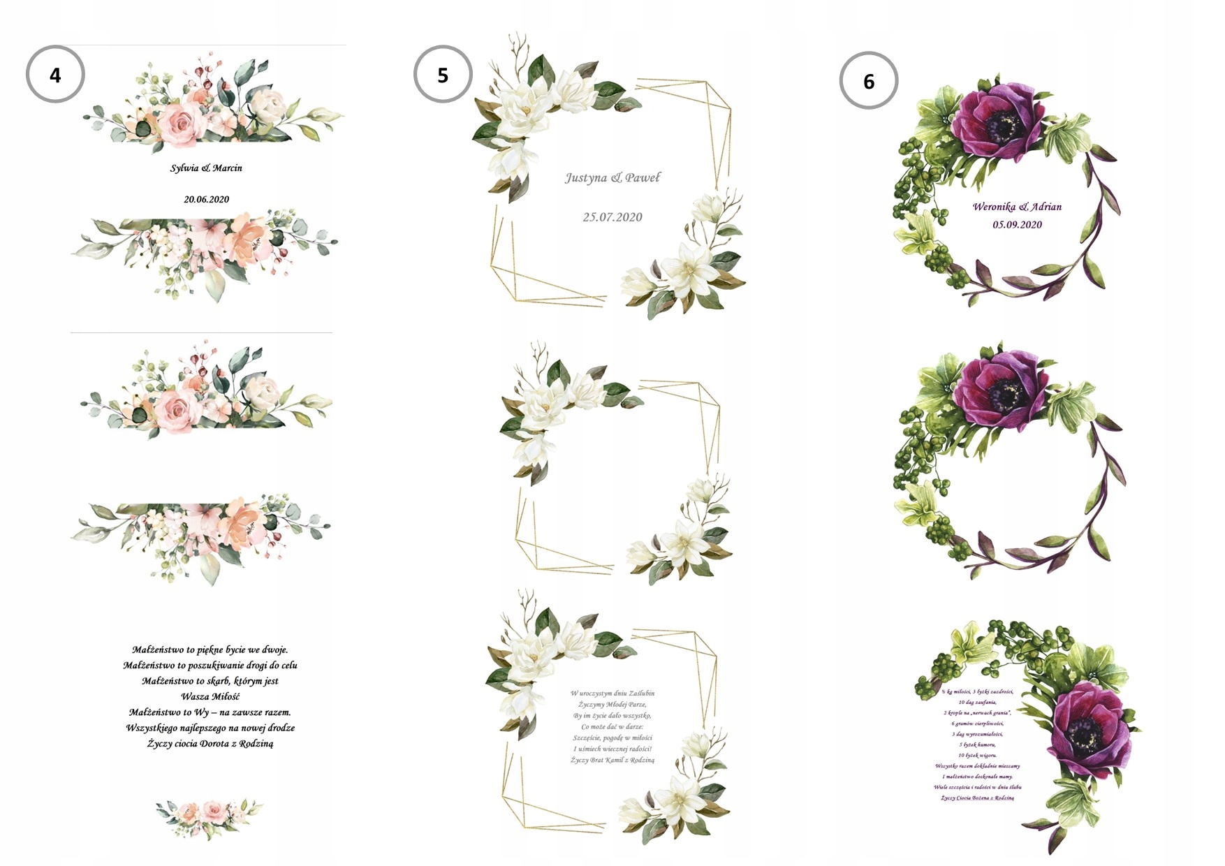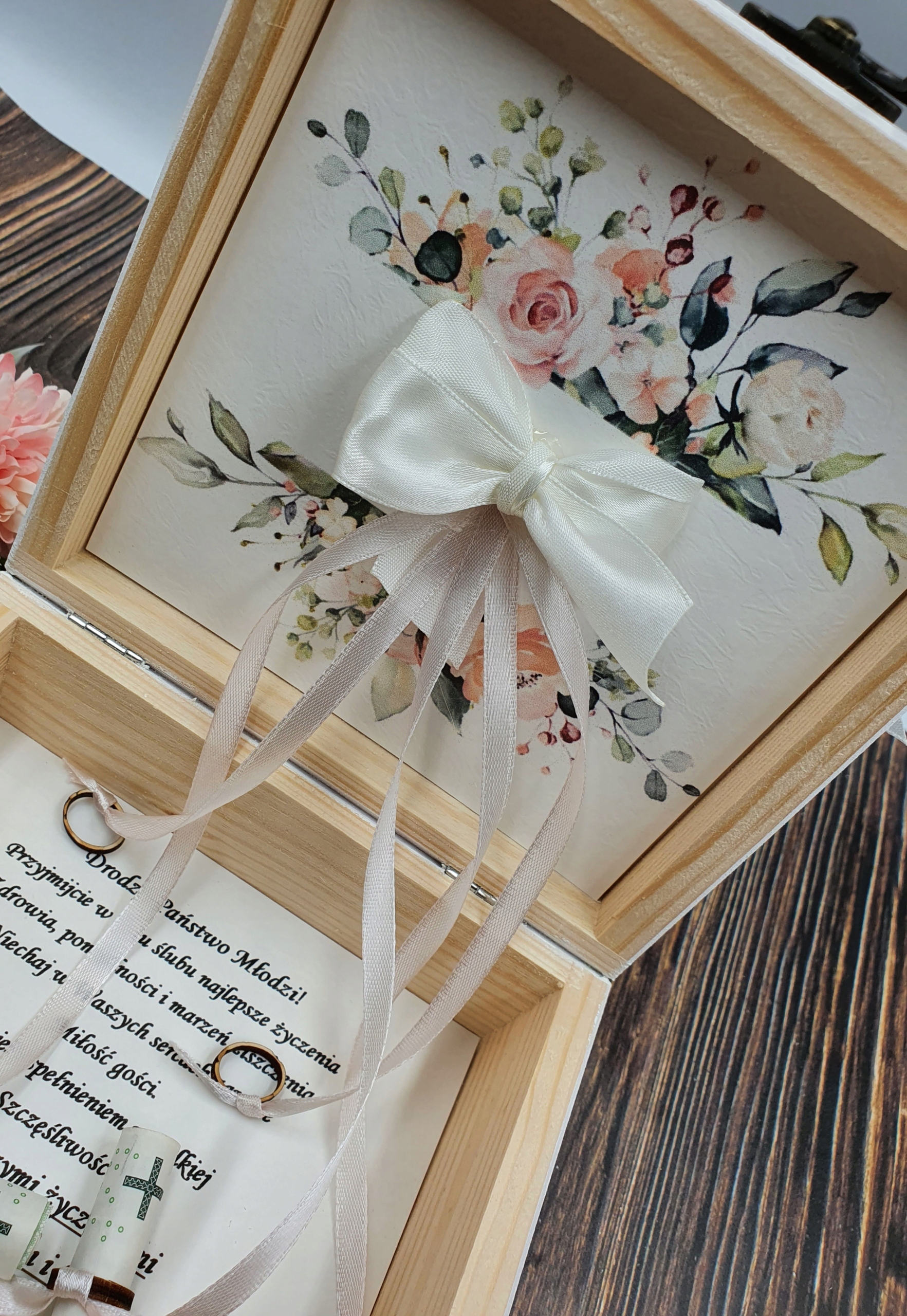 Коробка містить імена нареченого та нареченої, а також імена людей, які дарують подарунок. Ви також можете вибрати з великої кількості побажань на весілля (ви можете надіслати свої власні) і 6 квіткових зображень (кожна з бантом у верхній частині коробки та всередині).