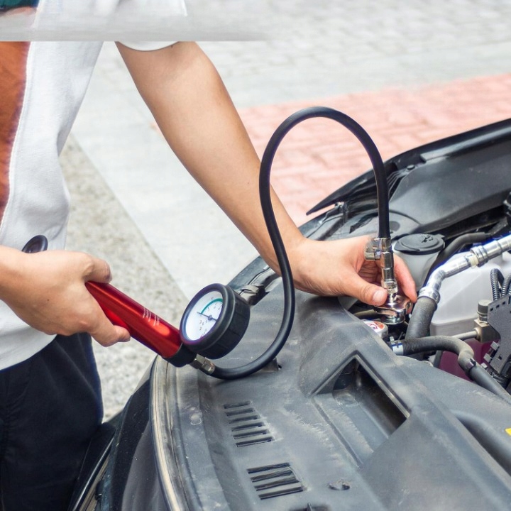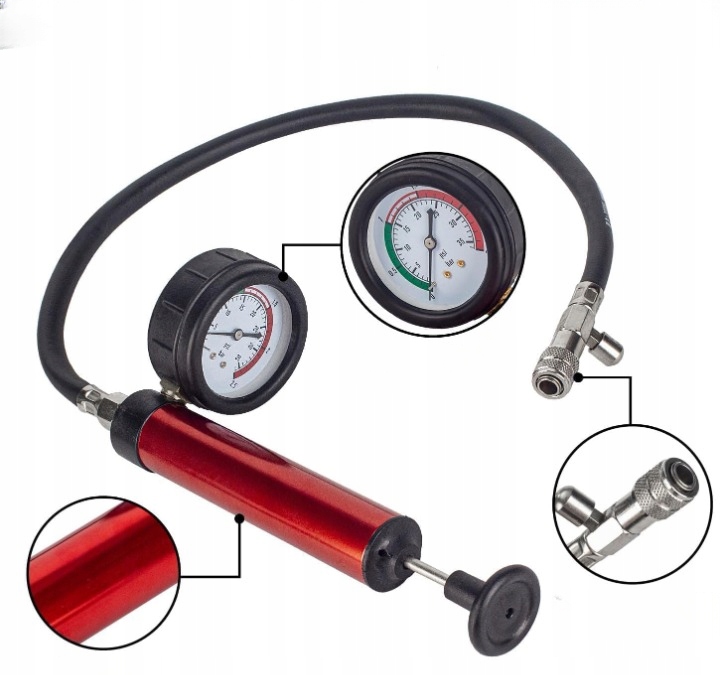 Тестер дозволяє легко збільшити тиск всередині системи охолодження шляхом накачування, що дозволяє швидко знайти витоки на основі спостереження за індикатором жолоба. Побудований надлишковий клапан полегшує повторення випробувань та тиску контролю. Набір також включає сталевий термометр, що вимірює температуру охолоджуючої рідини в діапазоні від 0 до 200 ° С