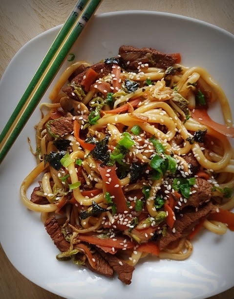 Додати яловичину і локшину удон. Все ретельно перемішуємо і смажимо близько 1 хвилини (бажаємо, щоб макарони були теплими). Зніміть з вогню, розкладіть по тарілках, посипте кунжутом, цибулею та/або червоним імбиром.